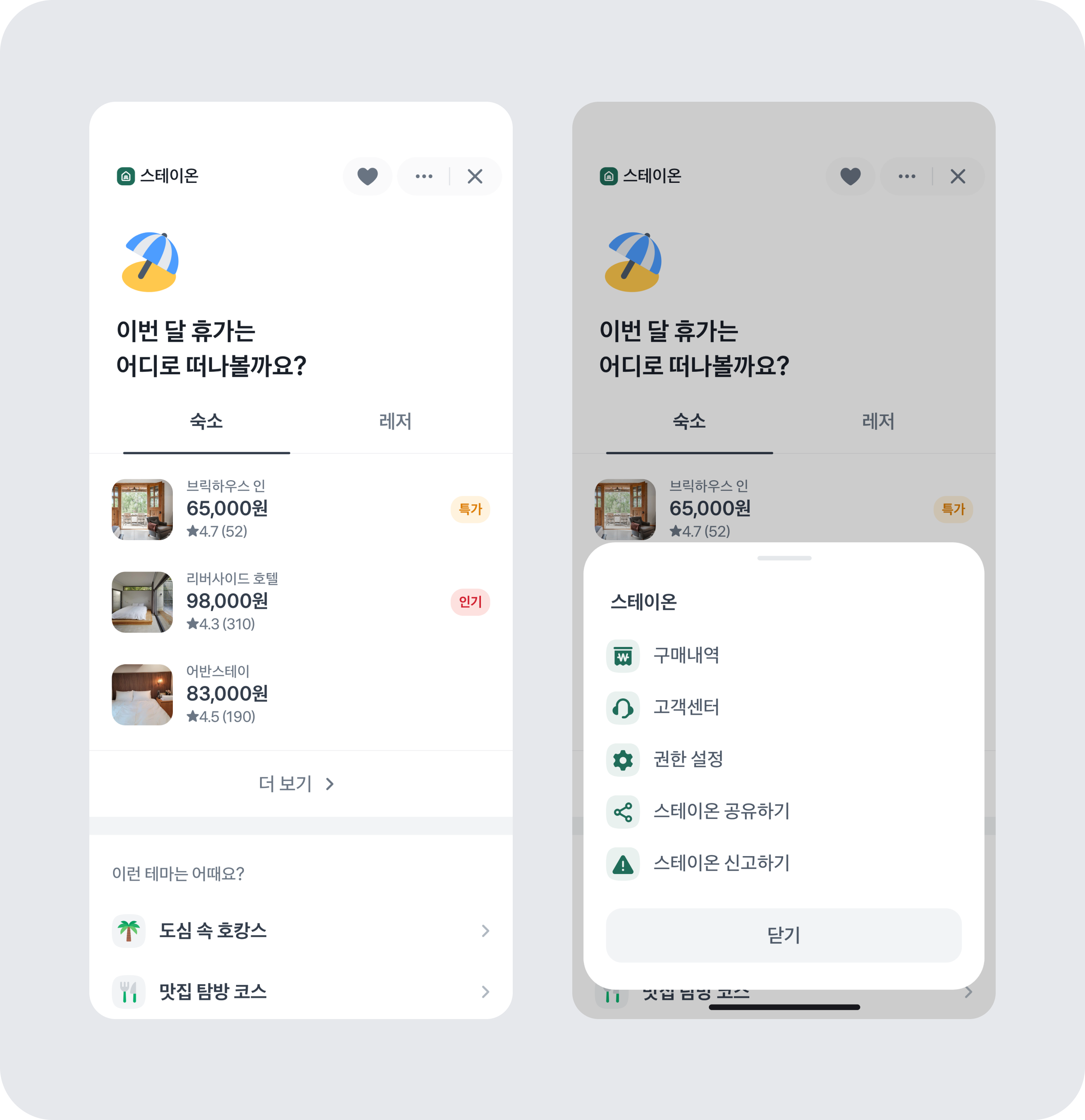 내비게이션 바의 더보기 버튼을 통해 공유하기, 신고하기 등의 기능을 쉽게 사용할 수 있어요.