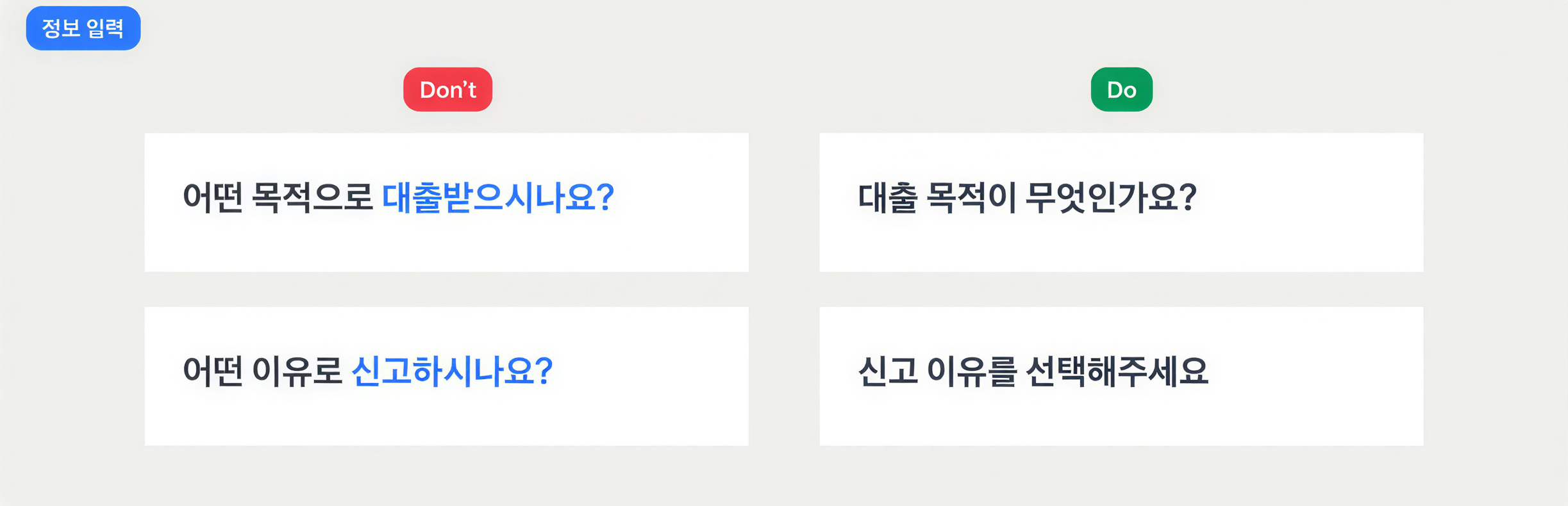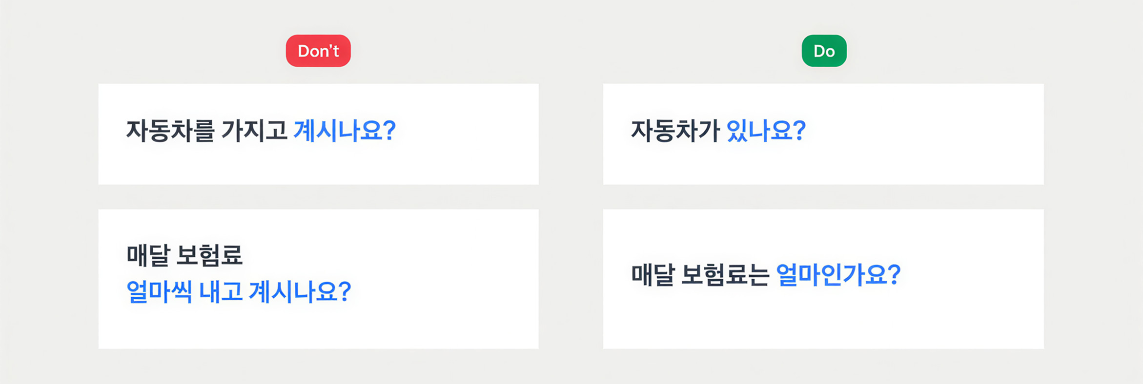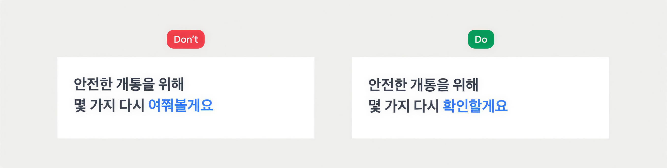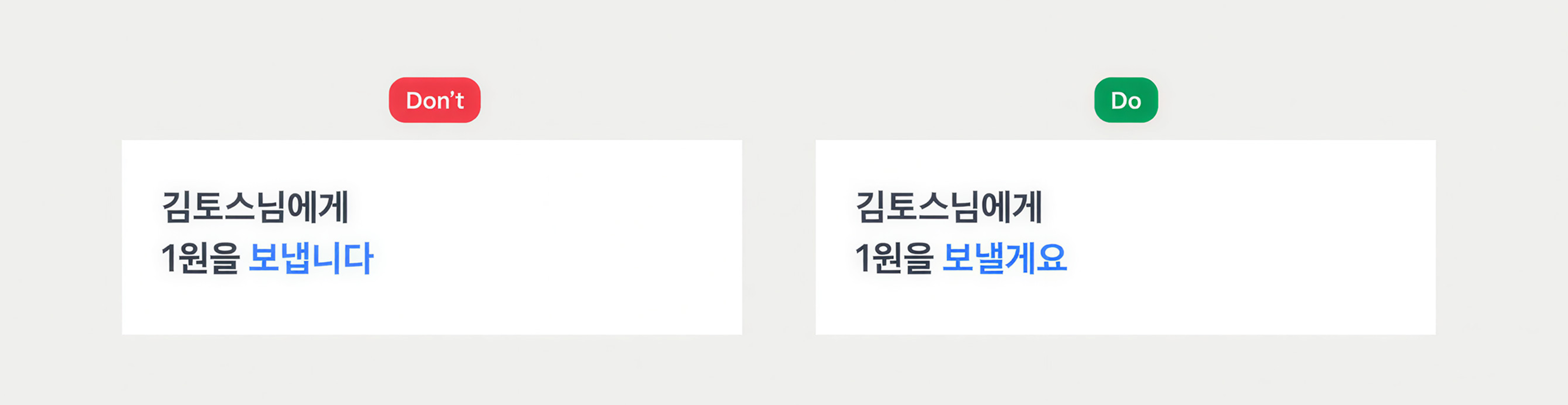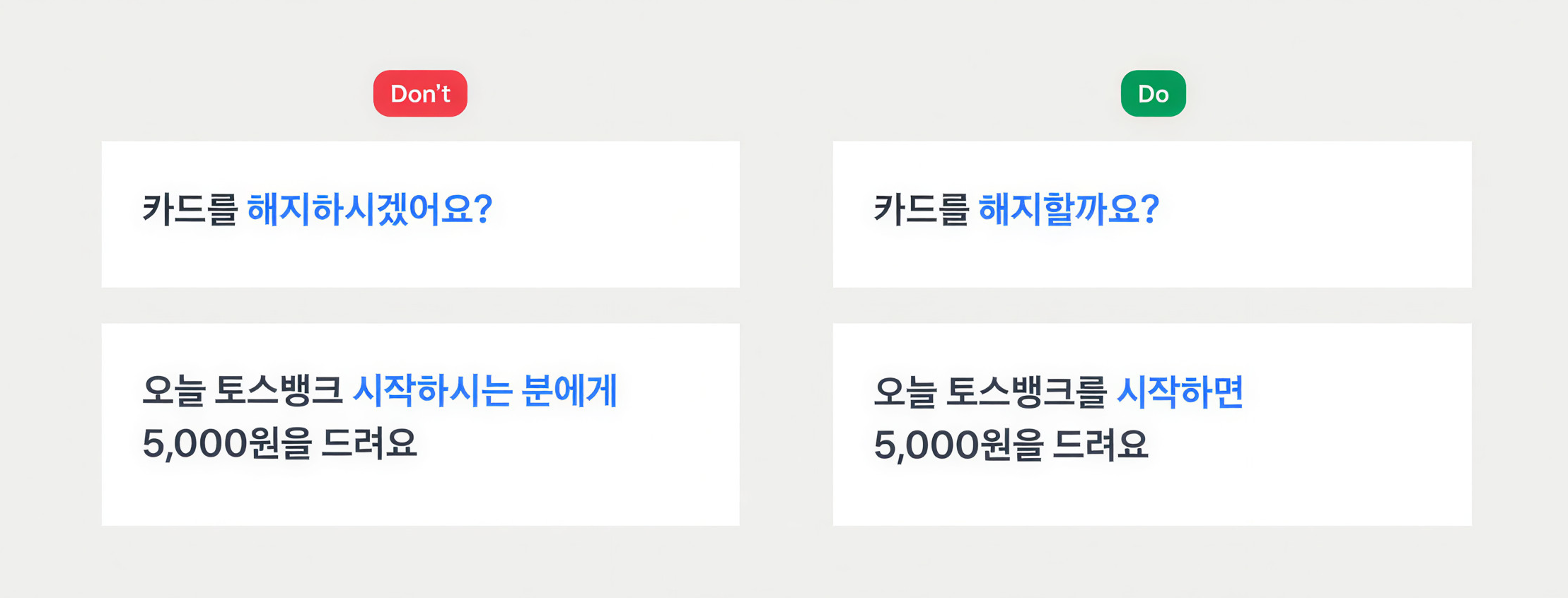 제품 안에서 ‘~시겠어요?’, ‘시나요?’, ‘~께’ 같은 과도한 경어를 쓰지 않아요.