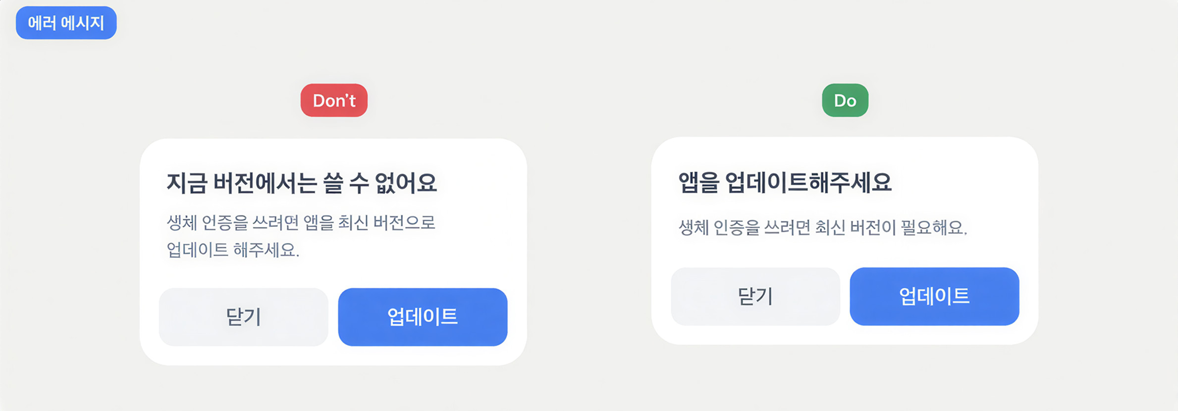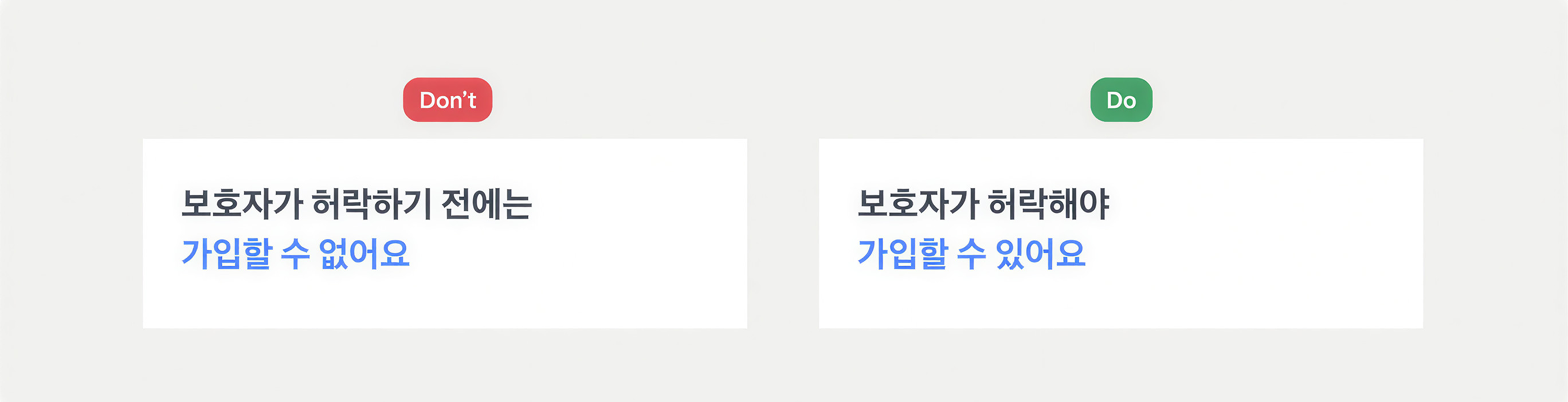 사용자에게 명확하게 부정적인 내용을 알려줘야 할 때는 부정형 문장을 써도 좋아요.⚠️ 서비스를 정책 상 쓸 수 없을 때