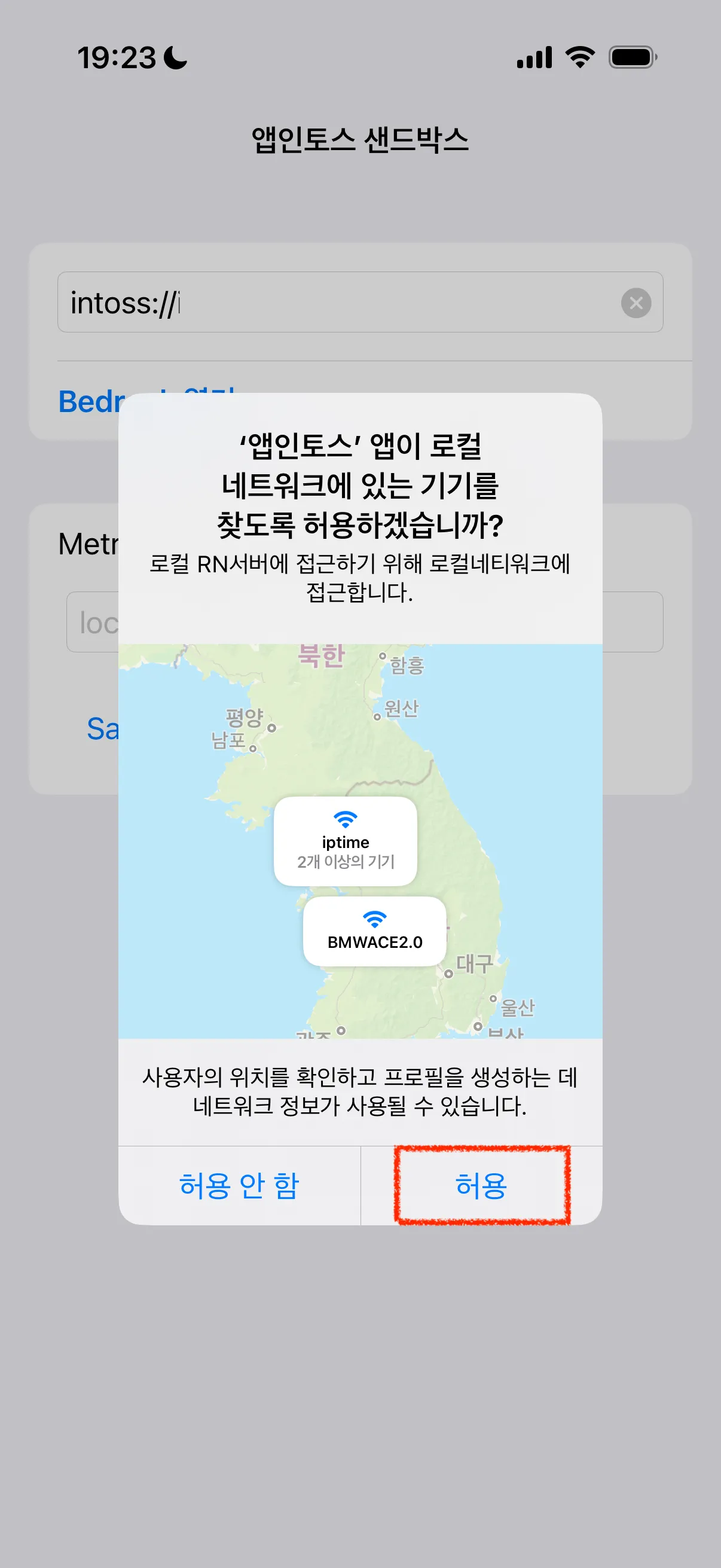 - 샌드박스 앱을 실행하면 "로컬 네트워크" 권한 요청 메시지가 표시돼요. 이때 "허용" 버튼을 눌러주세요.