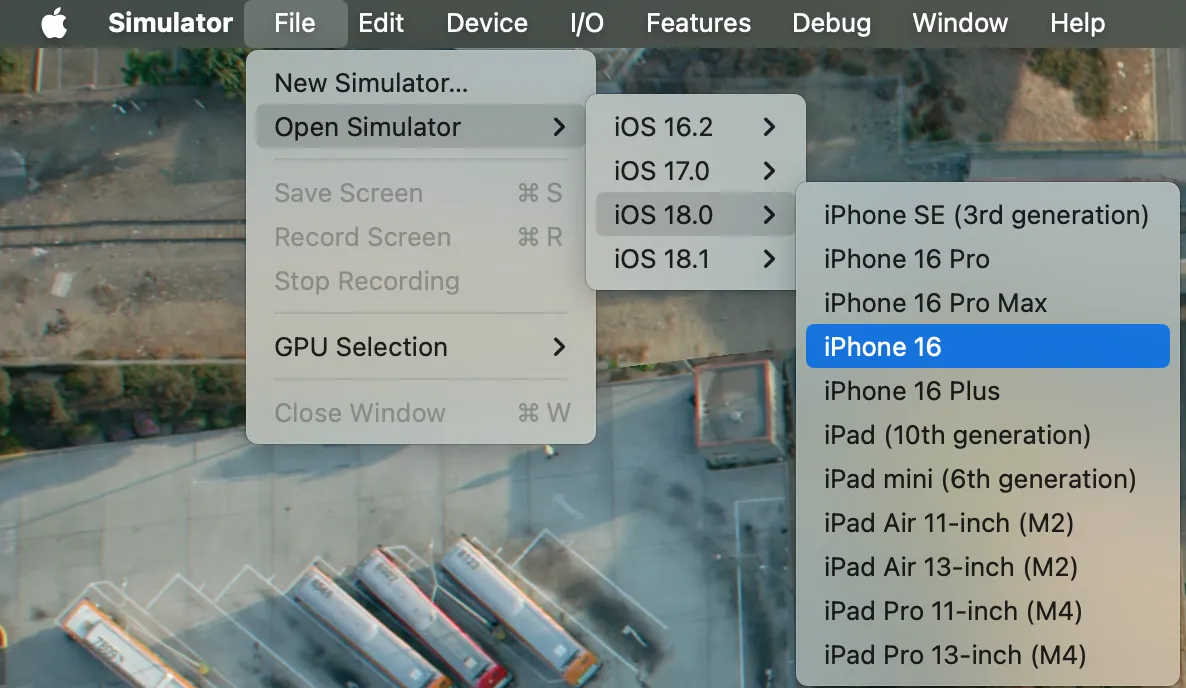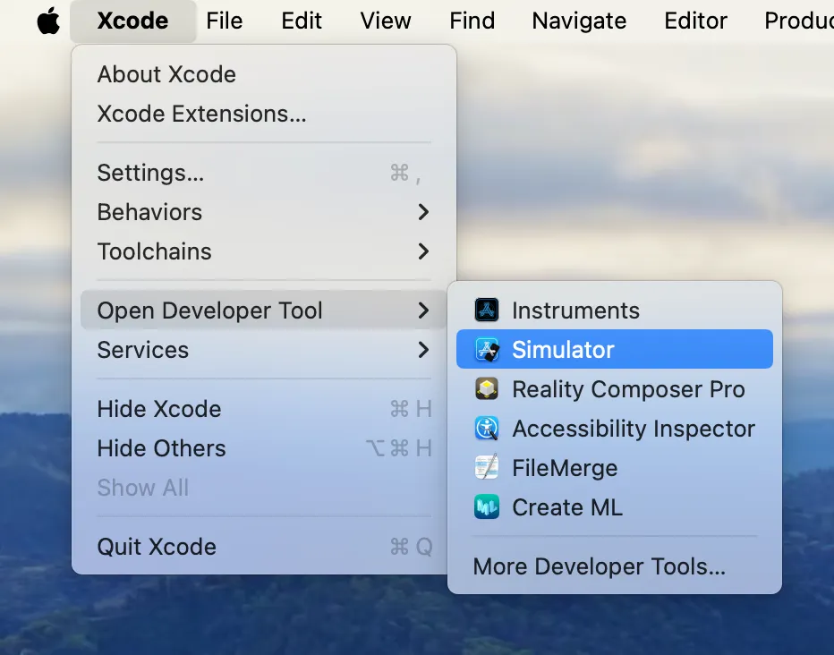 - XCode 상단 메뉴에서 [XCode] > [Open Developer Tool] > [Simulator] 를 선택하세요.