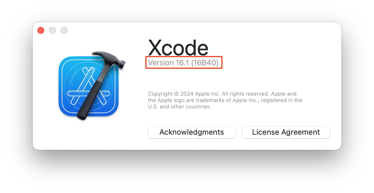 - XCode를 열고 상단 메뉴에서 [XCode] > [About XCode] 를 클릭하세요.
