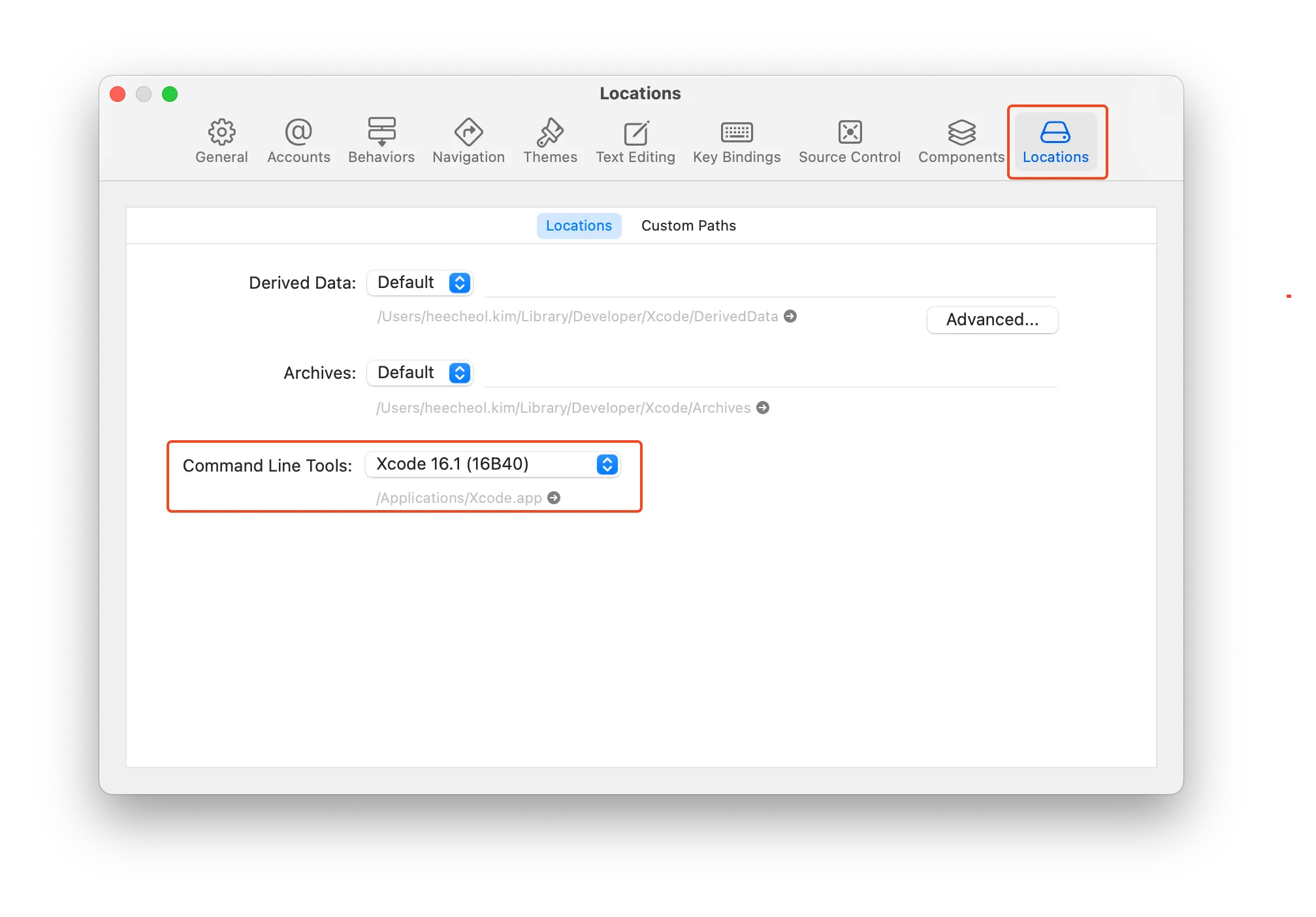 - [Locations] 탭으로 이동한 뒤, Command Line Tools 항목의 버전을 확인하세요.