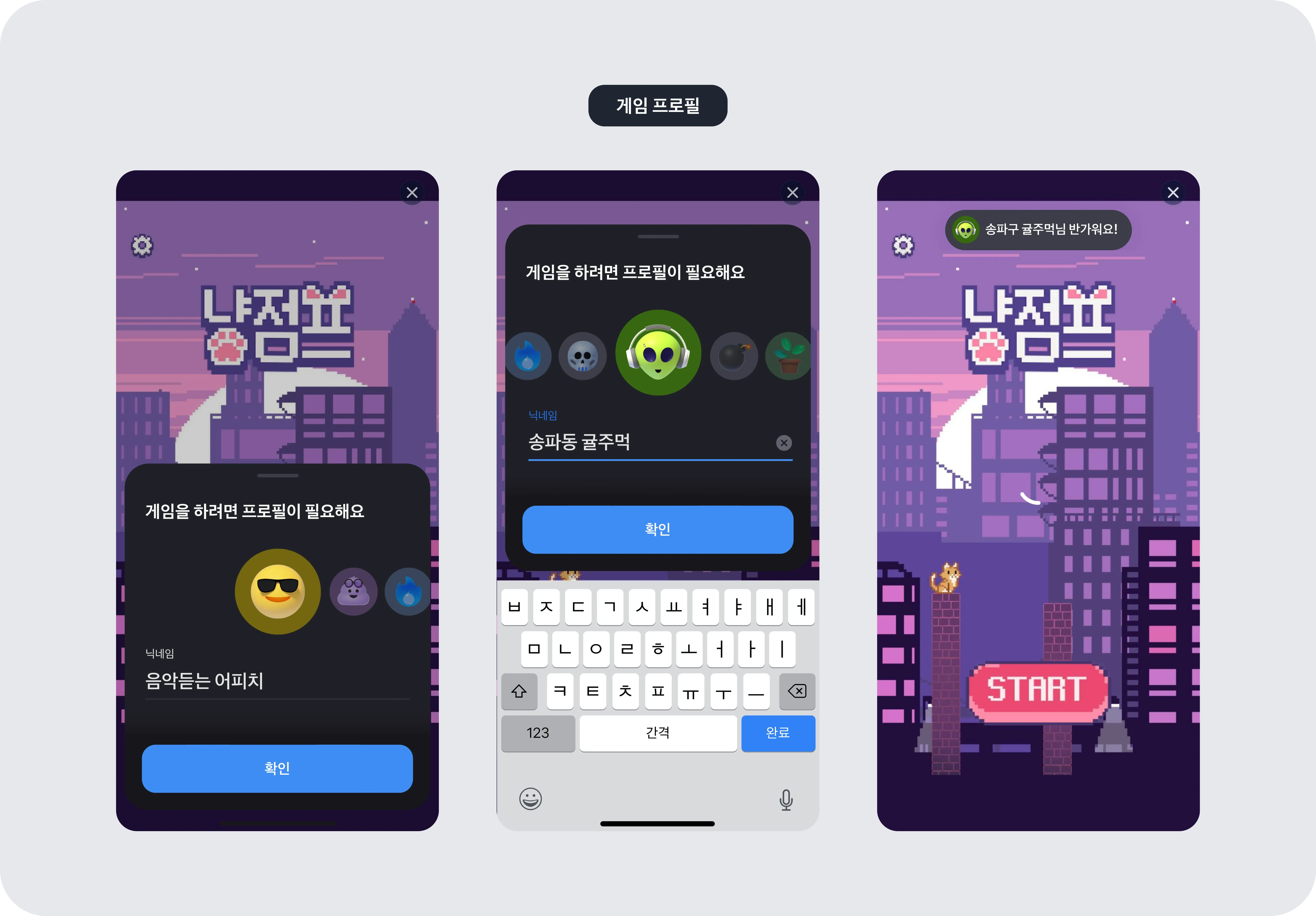 - 프로필을 한 번 생성하면 이후에는 게임 진입 시 자동으로 환영 메시지가 노출돼 온보딩 흐름이 자연스러워져요.