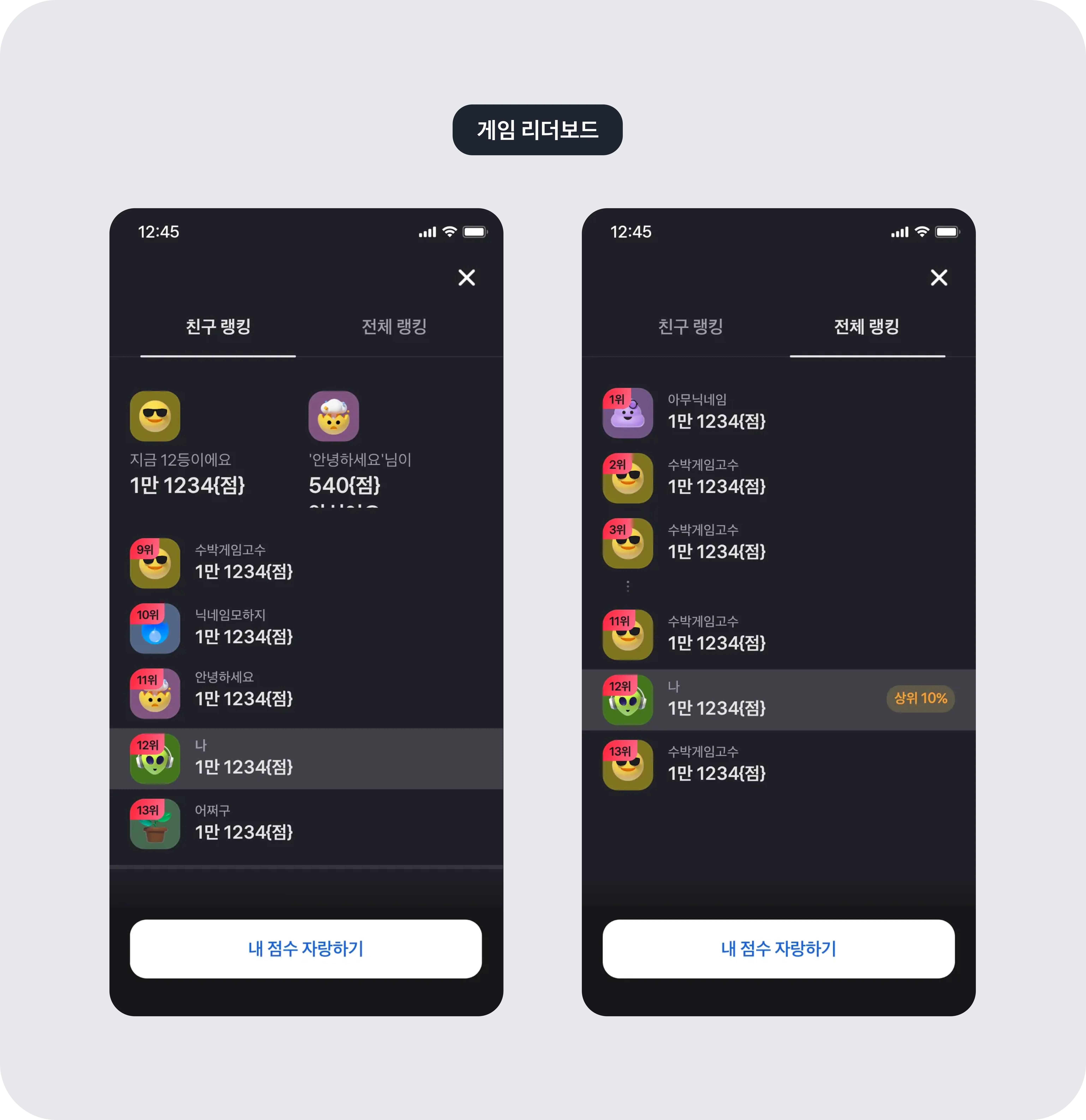 사용자는 리더보드를 보면서 다른 사용자와 친구를 맺을 수 있고, 친구에게 자신의 점수를 공유할 수도 있어요.