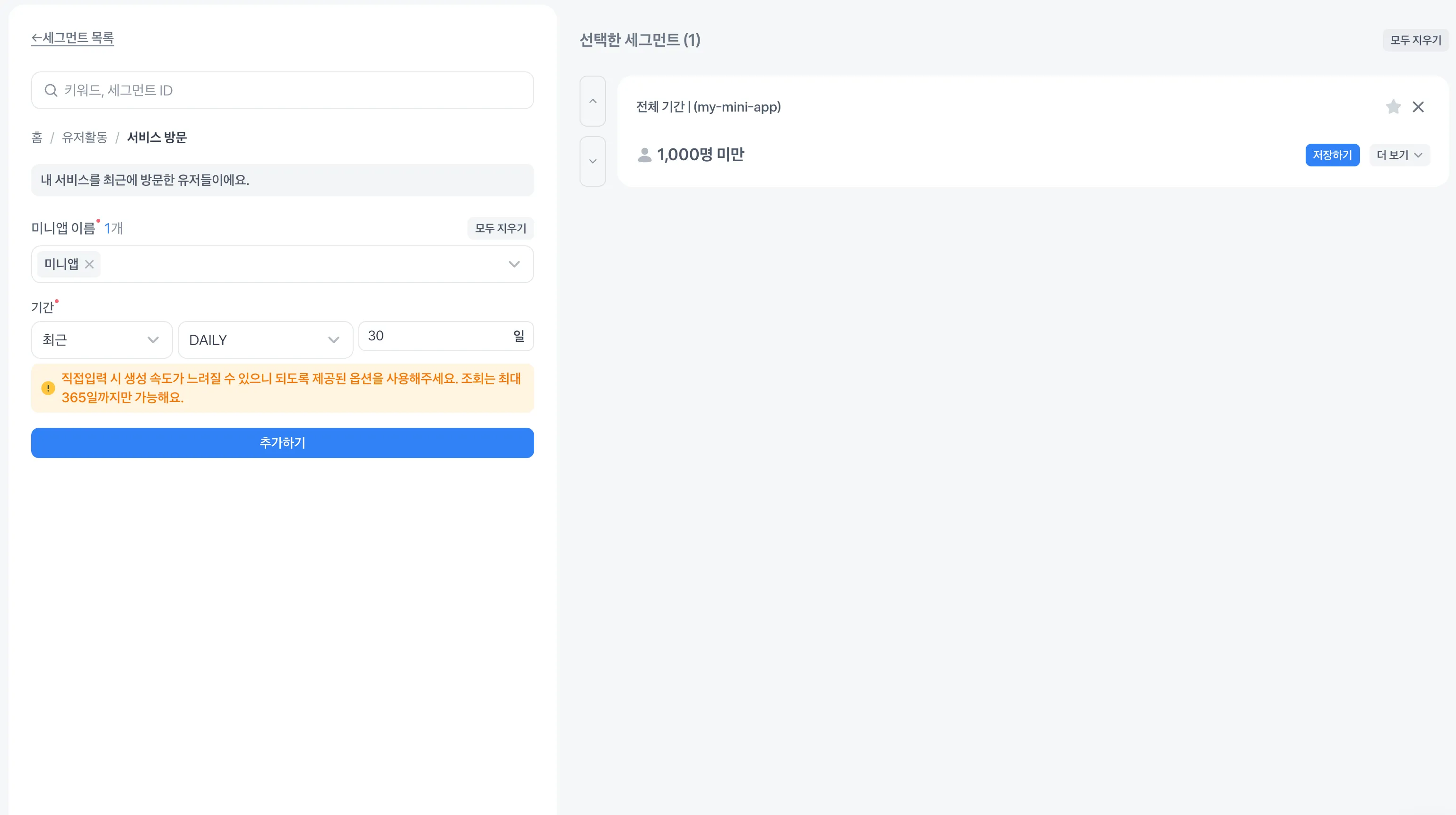 서비스 방문 세그먼트는 앱과 기간을 설정해 만들 수 있어요.