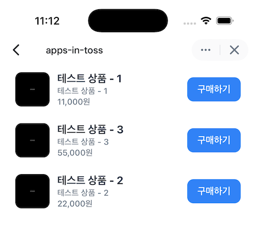 토스앱 내에서 동작할 때는 승인된 실제 상품 목록이 정상적으로 표시돼요
