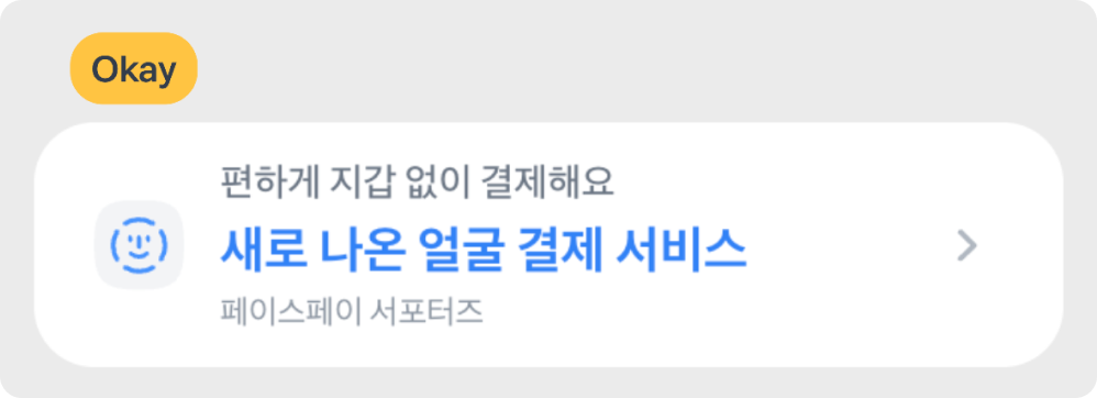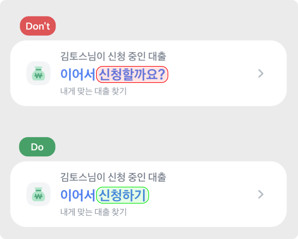 토스에는 다양한 배경의 사용자가 있어요. 자주 쓰는 유행어나 줄임말도 일부 사용자에게는 낯설 수 있어요. 더 많은 사용자에게 가치를 전달할 수 있도록, 복잡한 표현보다 쉽고 익숙한 단어로 풀어쓰세요.