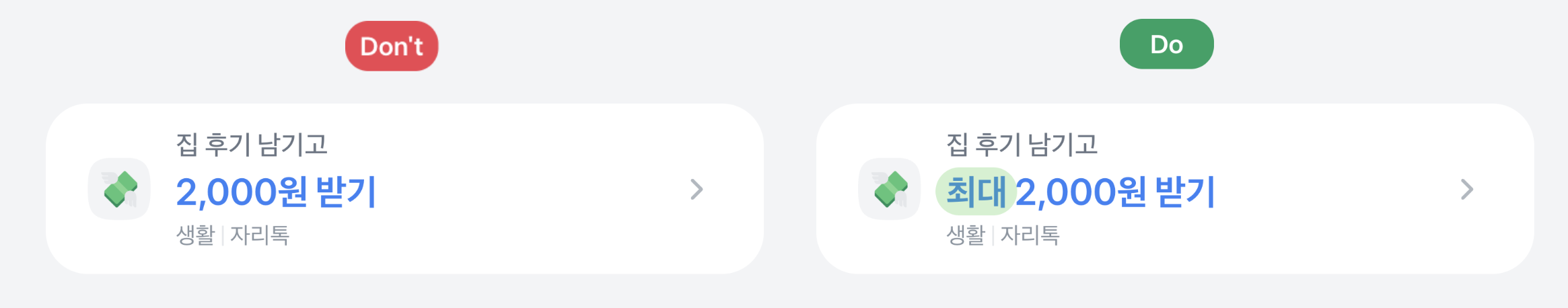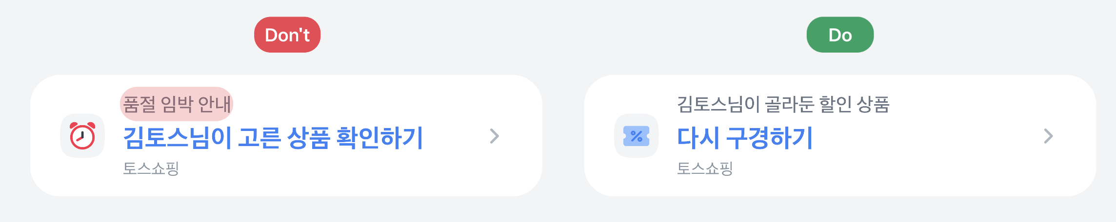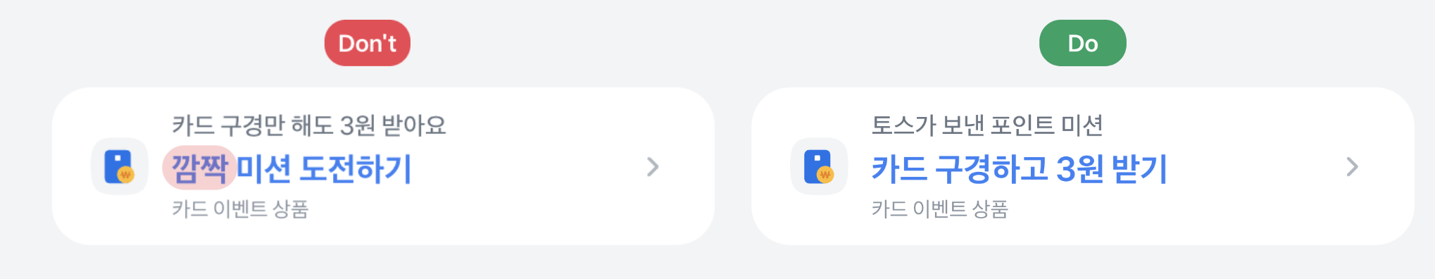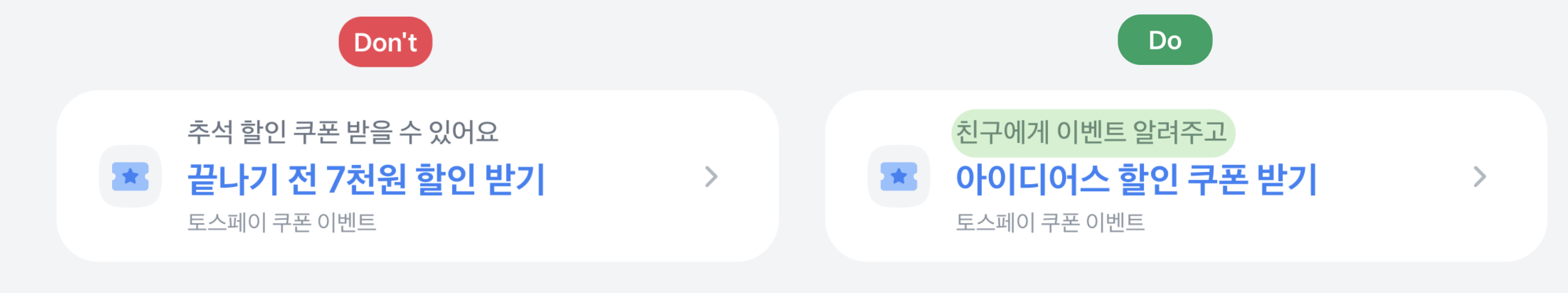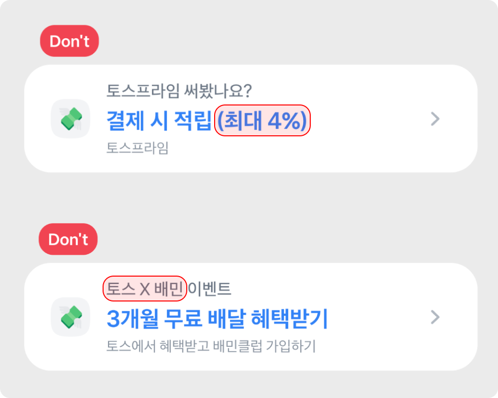 - 아이콘은 토스 리소스 센터에서 제공하는 2D 아이콘만 사용할 수 있어요. 이미지 가공은 불가해요.