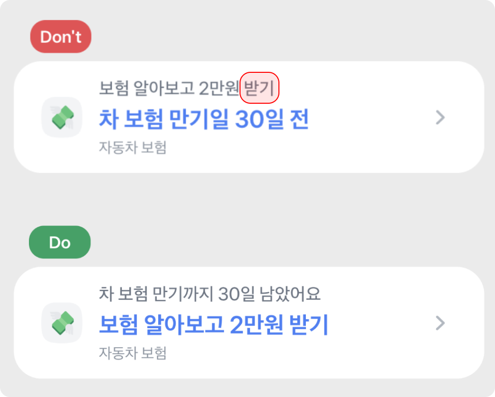 - 하단 문구는 '보러가기', '확인하기', '신청하기' 와 같이 '~하기' 로 작성해 주세요.