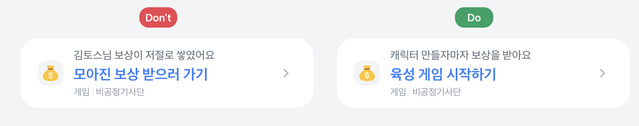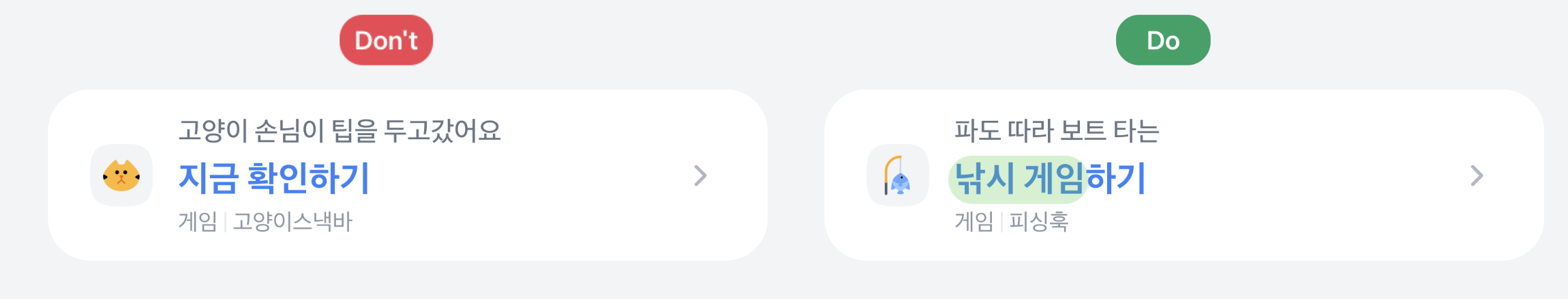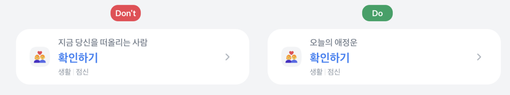- 하단 문구는 사용자로 하여금 액션을 유도하는 문구예요. '확인하기', '보러가기'와 같이 간결하게 작성해 주세요.