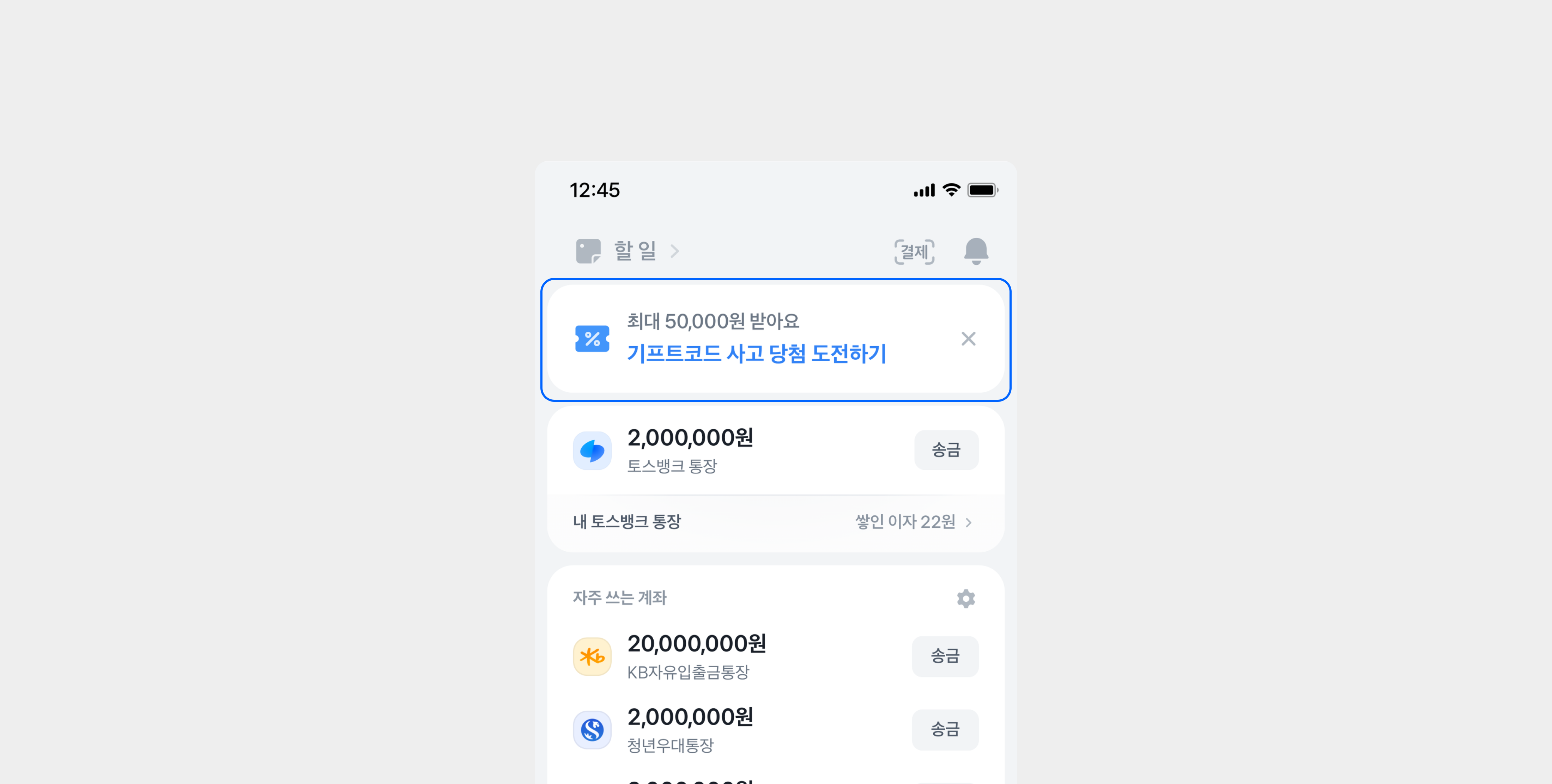 - 토스 앱 첫 화면인 홈의 상단에 노출되기 때문에 가장 많은 사용자에게 도달해요.