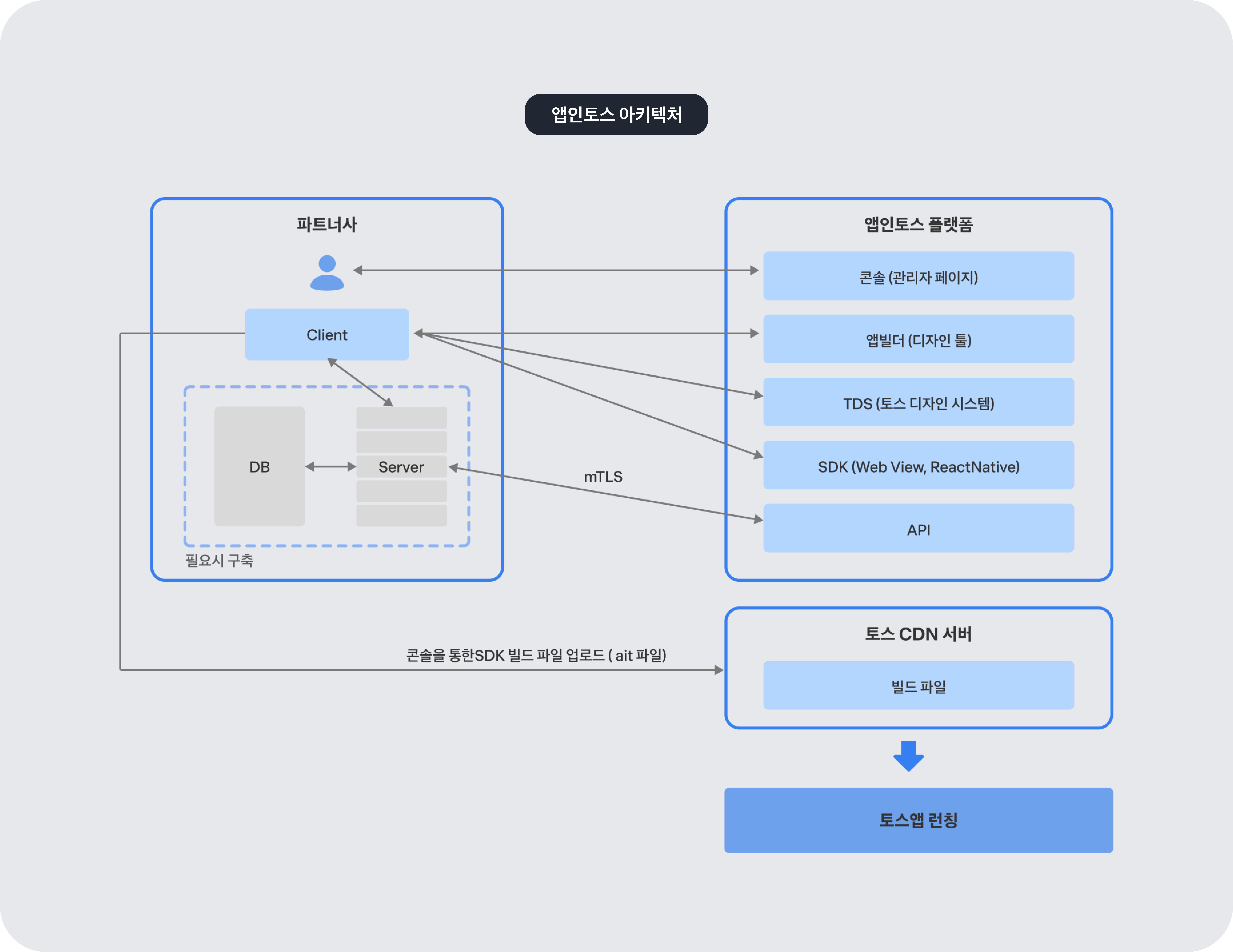 SDK를 적용한 빌드 결과물을 콘솔에 업로드하면, 토스 CDN 서버에 업로드 및 호스팅되는 구조예요.