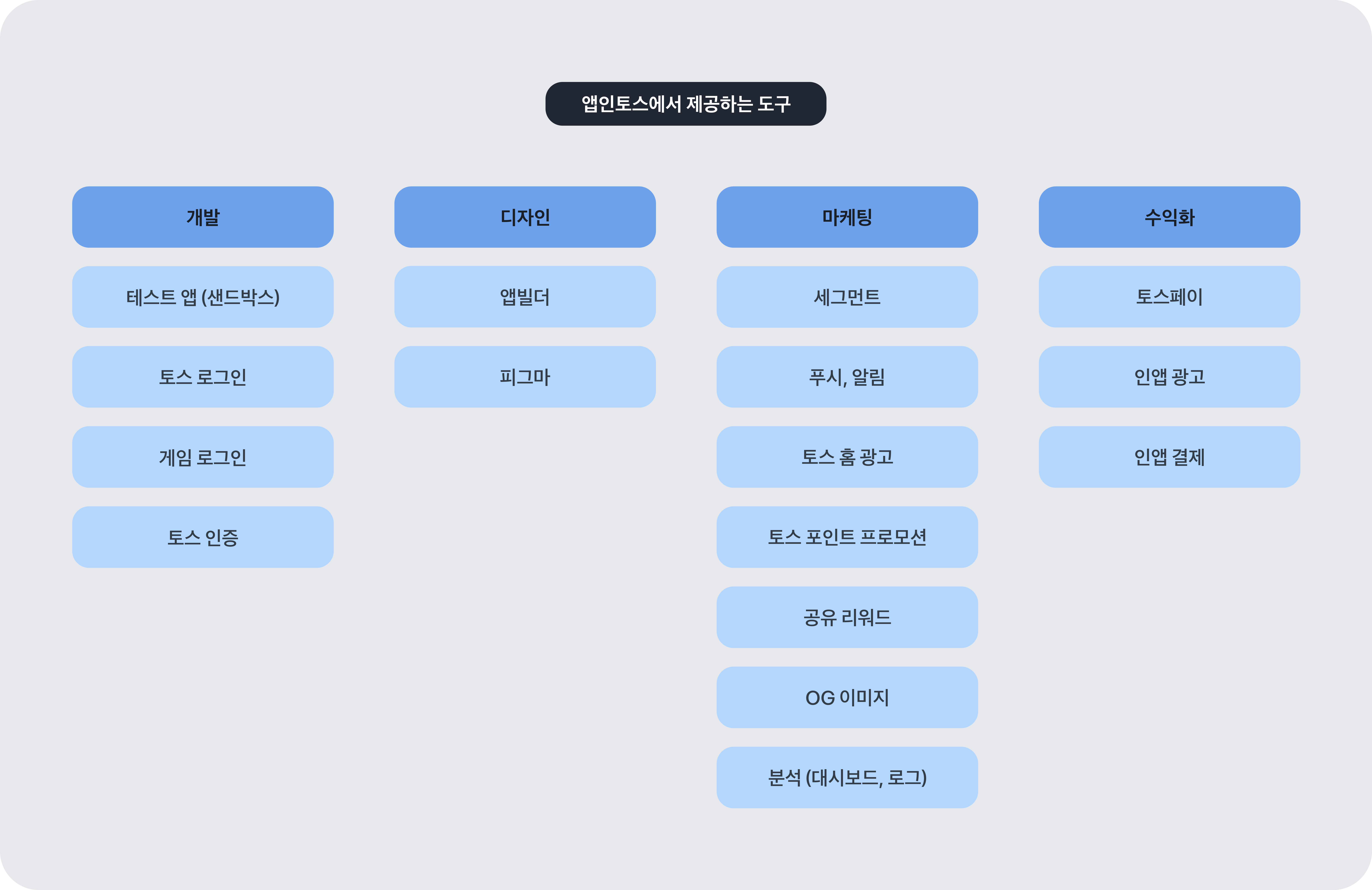 누구나 최소한의 리소스로 빠르게 앱을 개발하고, 토스의 강력한 유저 풀에서 성장할 수 있도록 필수적인 기능과 도구를 제공해요.