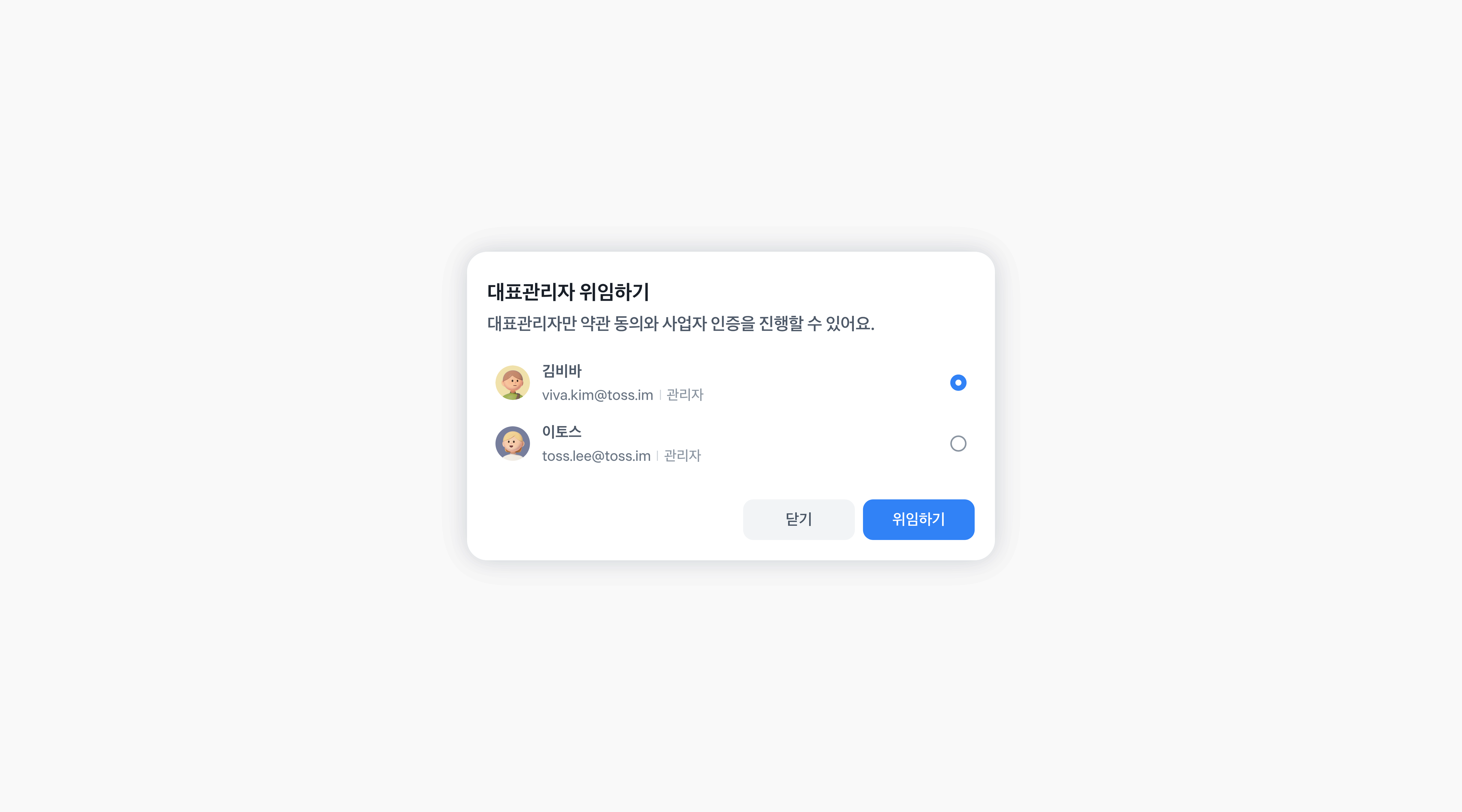 대표관리자를 변경하려면 현재 대표관리자가 본인 이름 우측의 [권한 위임] 버튼을 눌러 주세요.