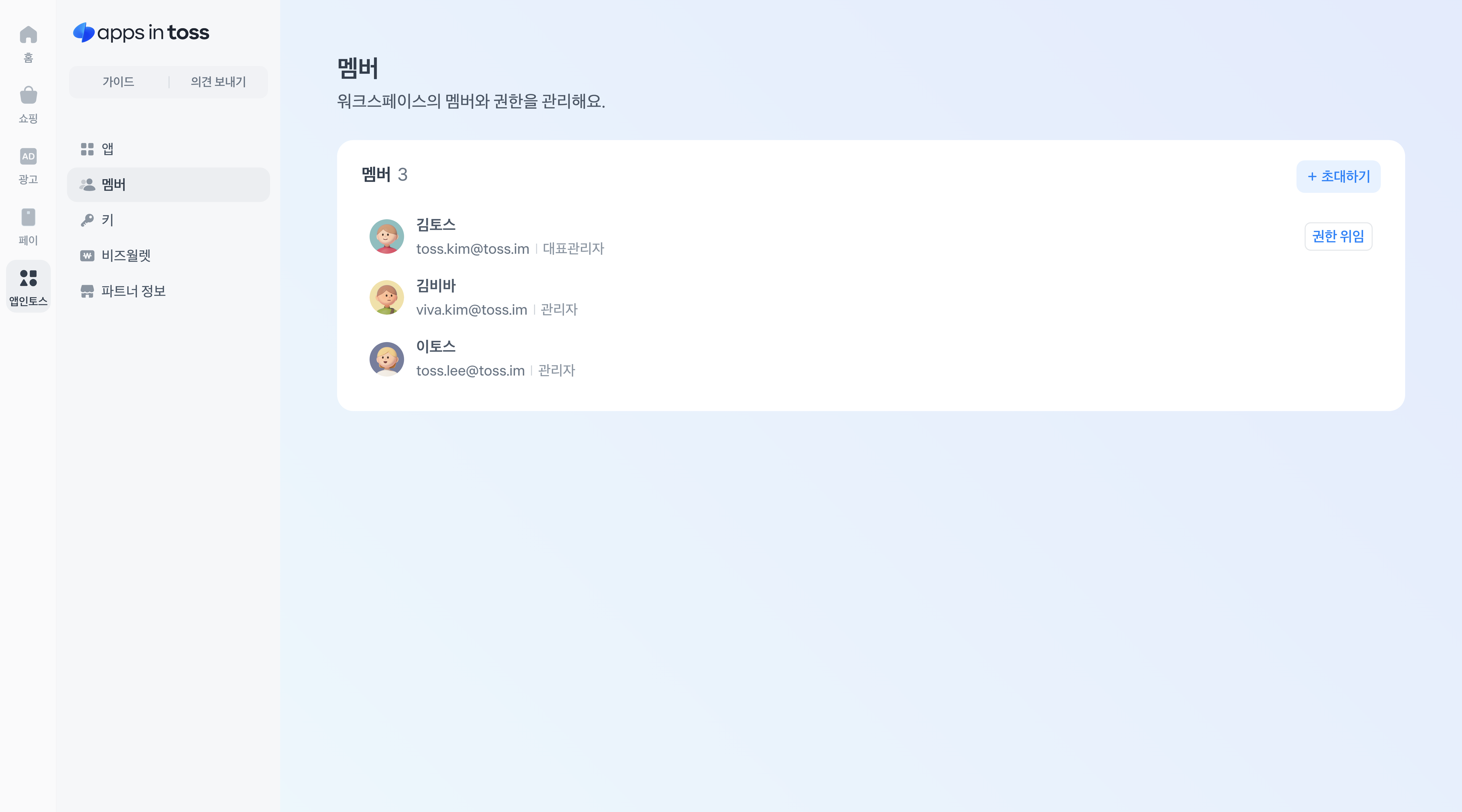 워크스페이스를 만든 사람에게 자동으로 '대표관리자' 권한이 부여돼요. 대표관리자는 멤버 초대 및 권한을 설정할 수 있어요.