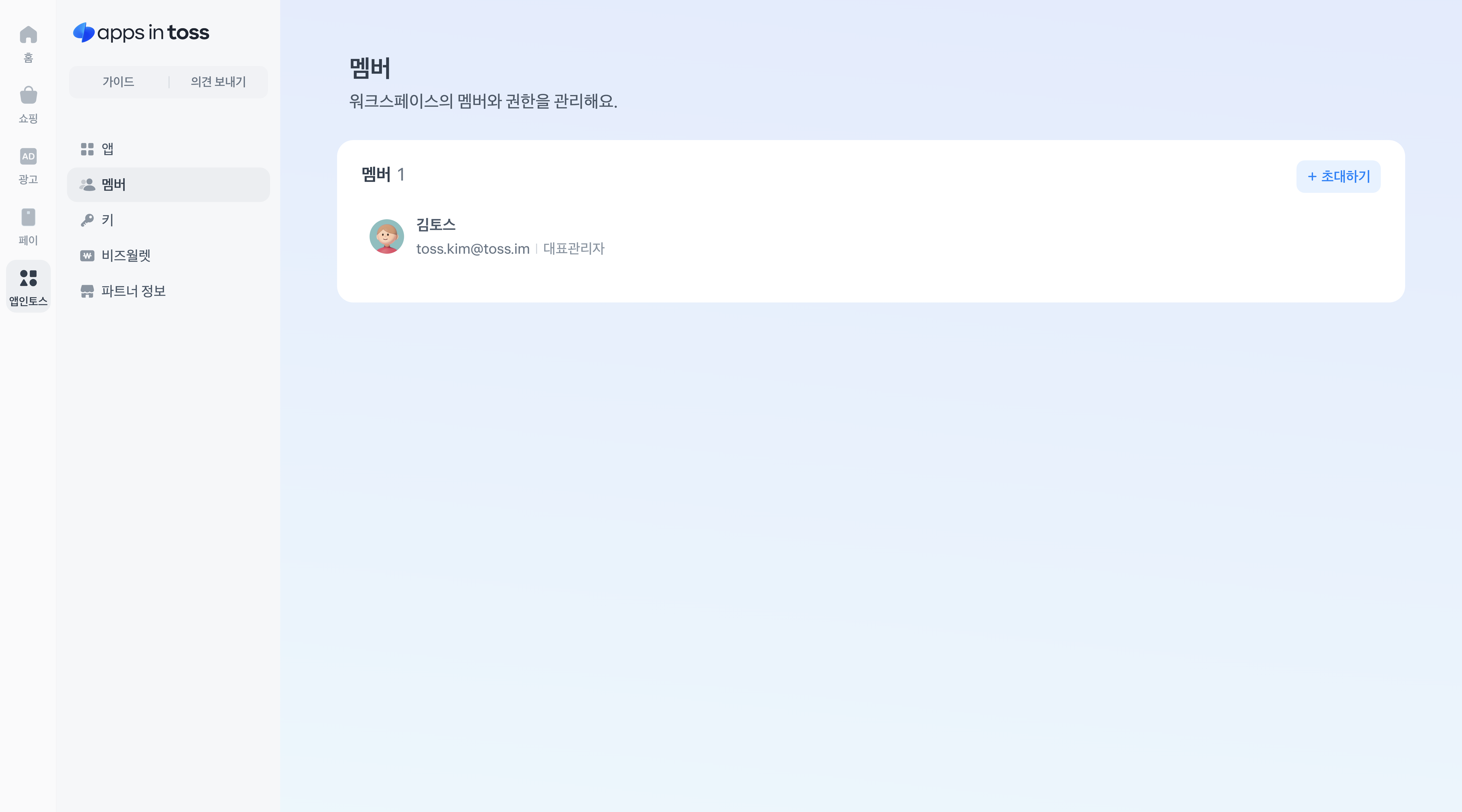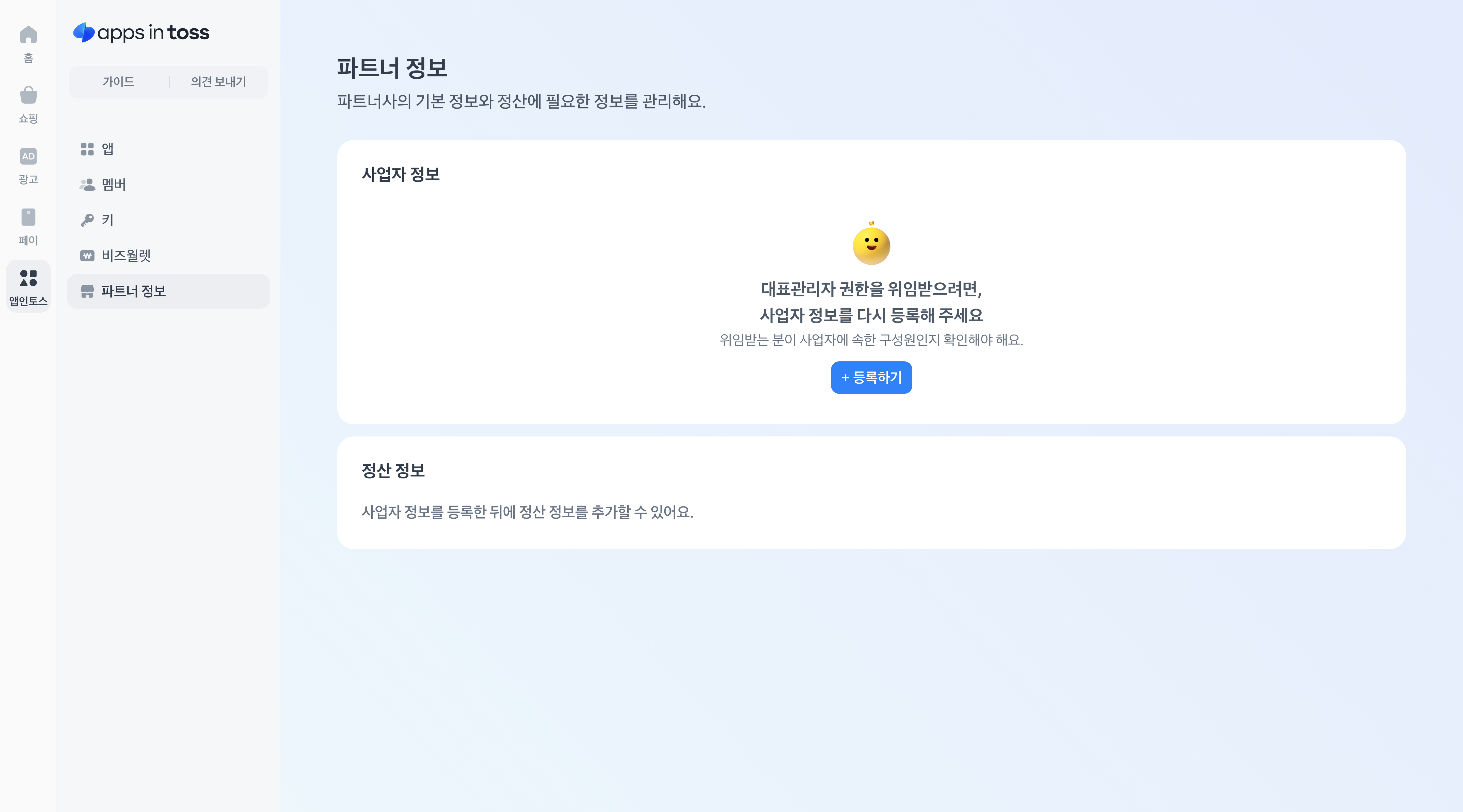 - 테스트 앱은 사업자 인증 없이도 만들 수 있어요. 단, 사업자 인증(대표 관리자 신청)이 되지 않으면 수익화 기능 및 토스 로그인을 사용할 수 없어요.