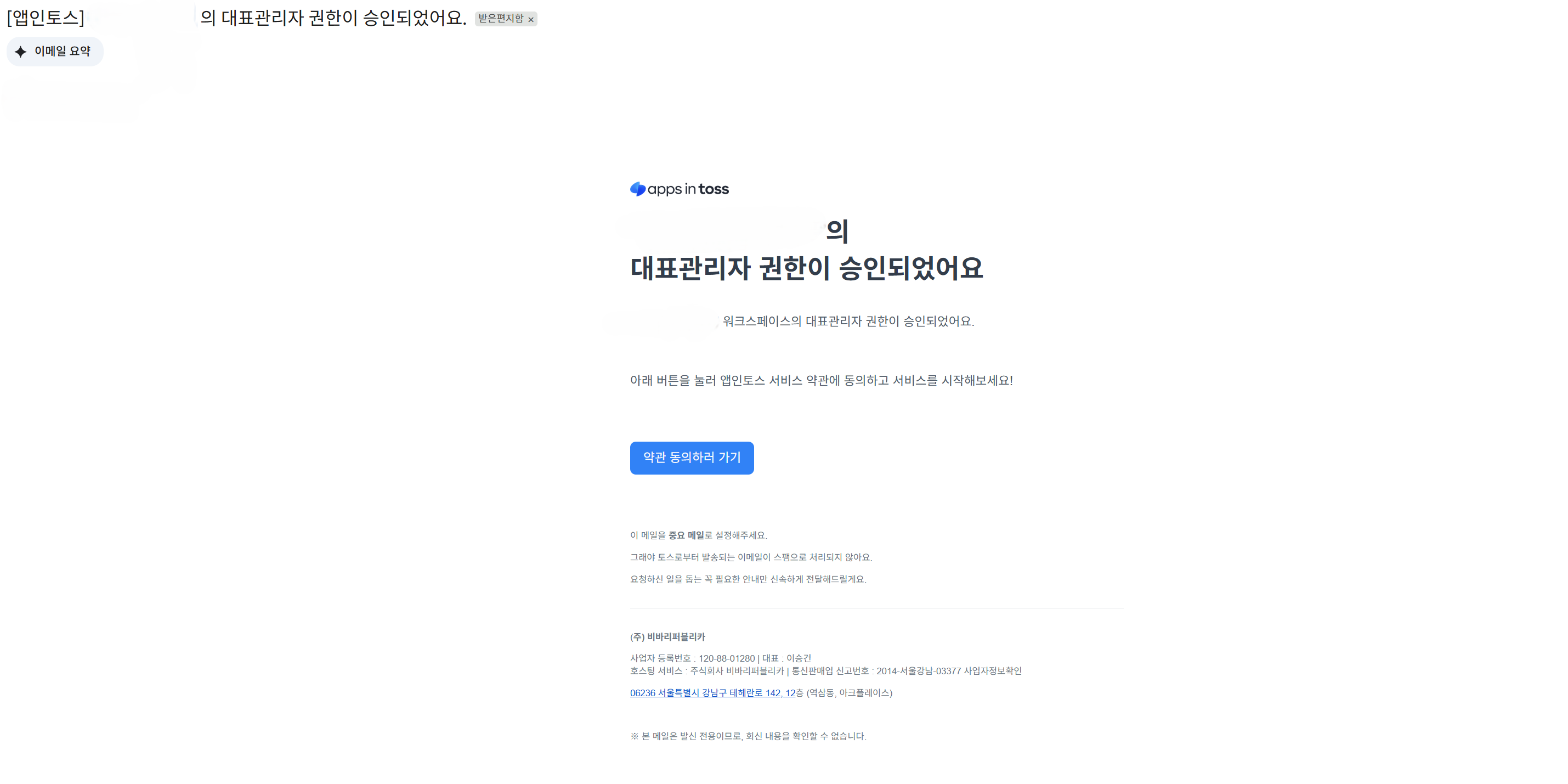 대표 관리자 권한 신청이 승인되면, 대표 관리자의 이메일로 본 계약 관련 메일이 전송돼요.