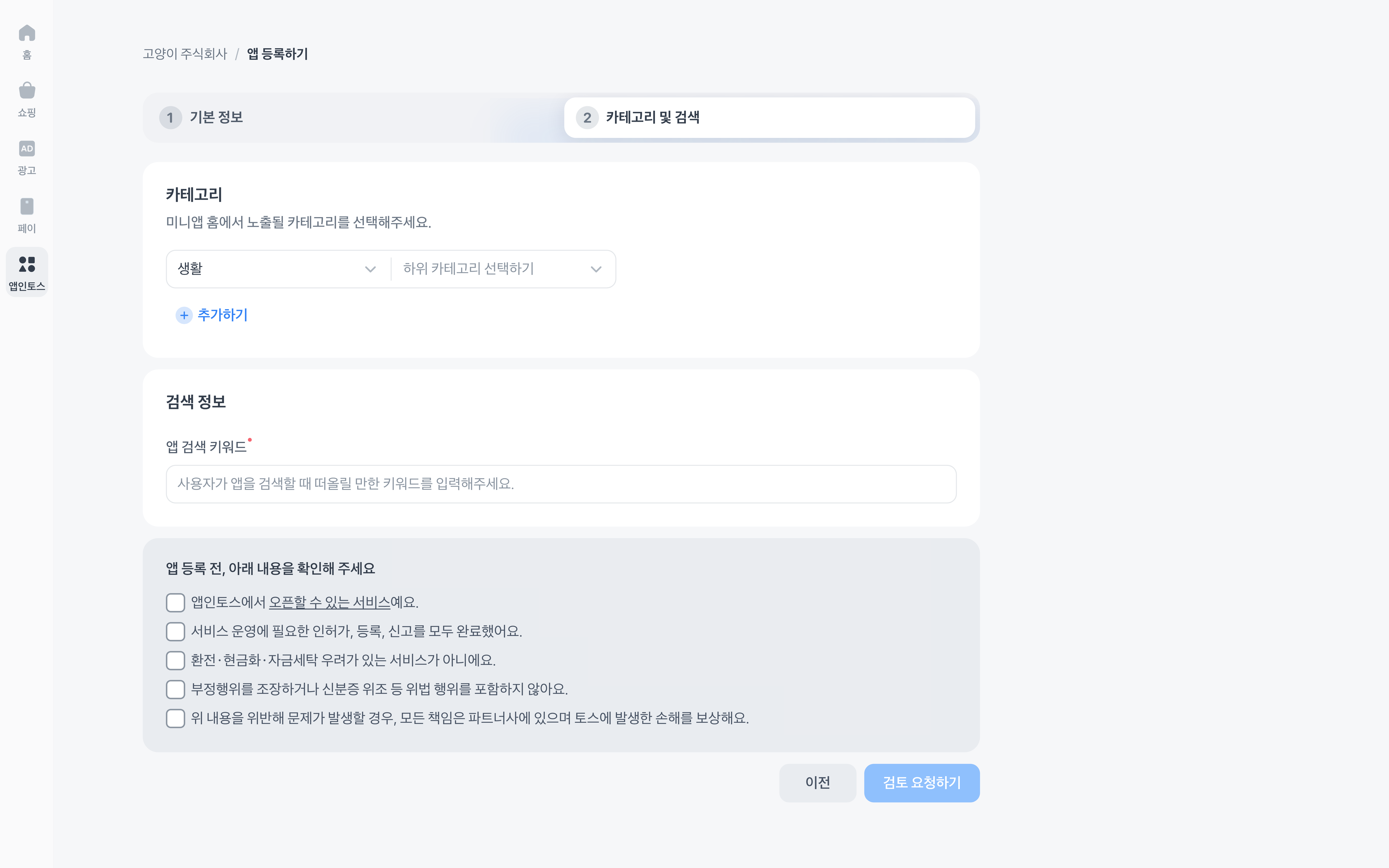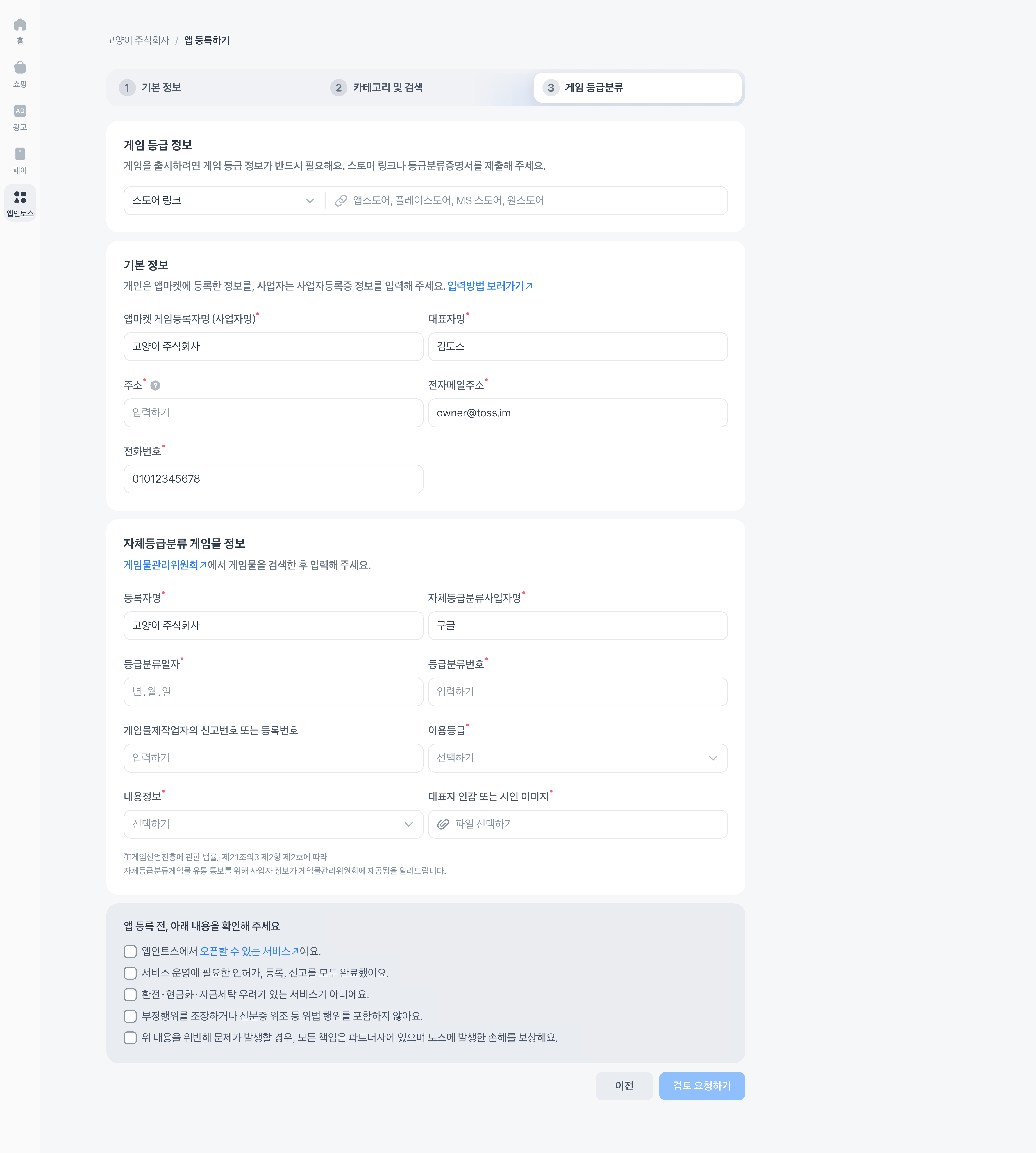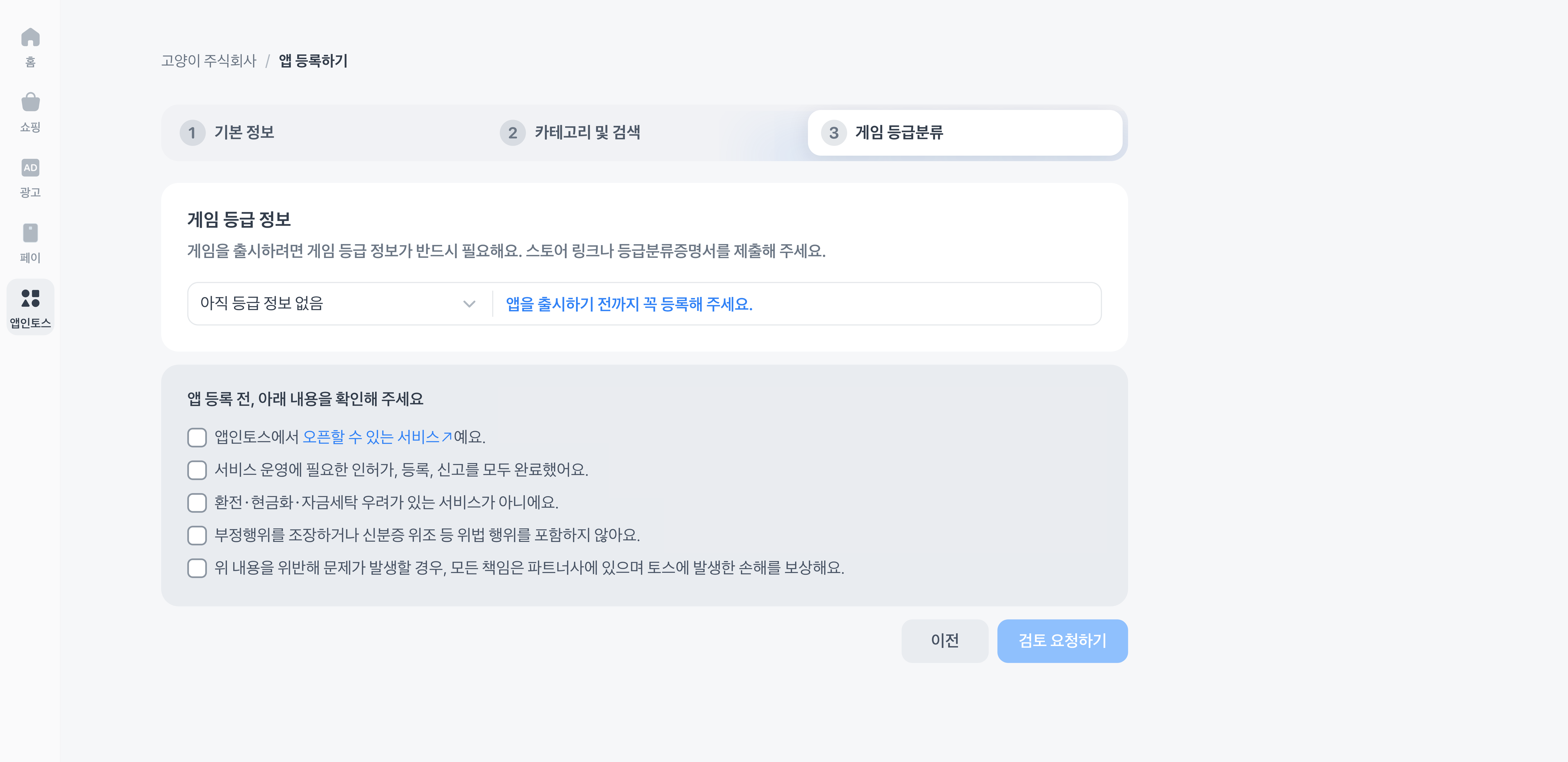앱 등록 가이드라인에 알맞게 입력을 완료한 이후 ‘검토 요청하기’ 버튼을 눌러주세요.