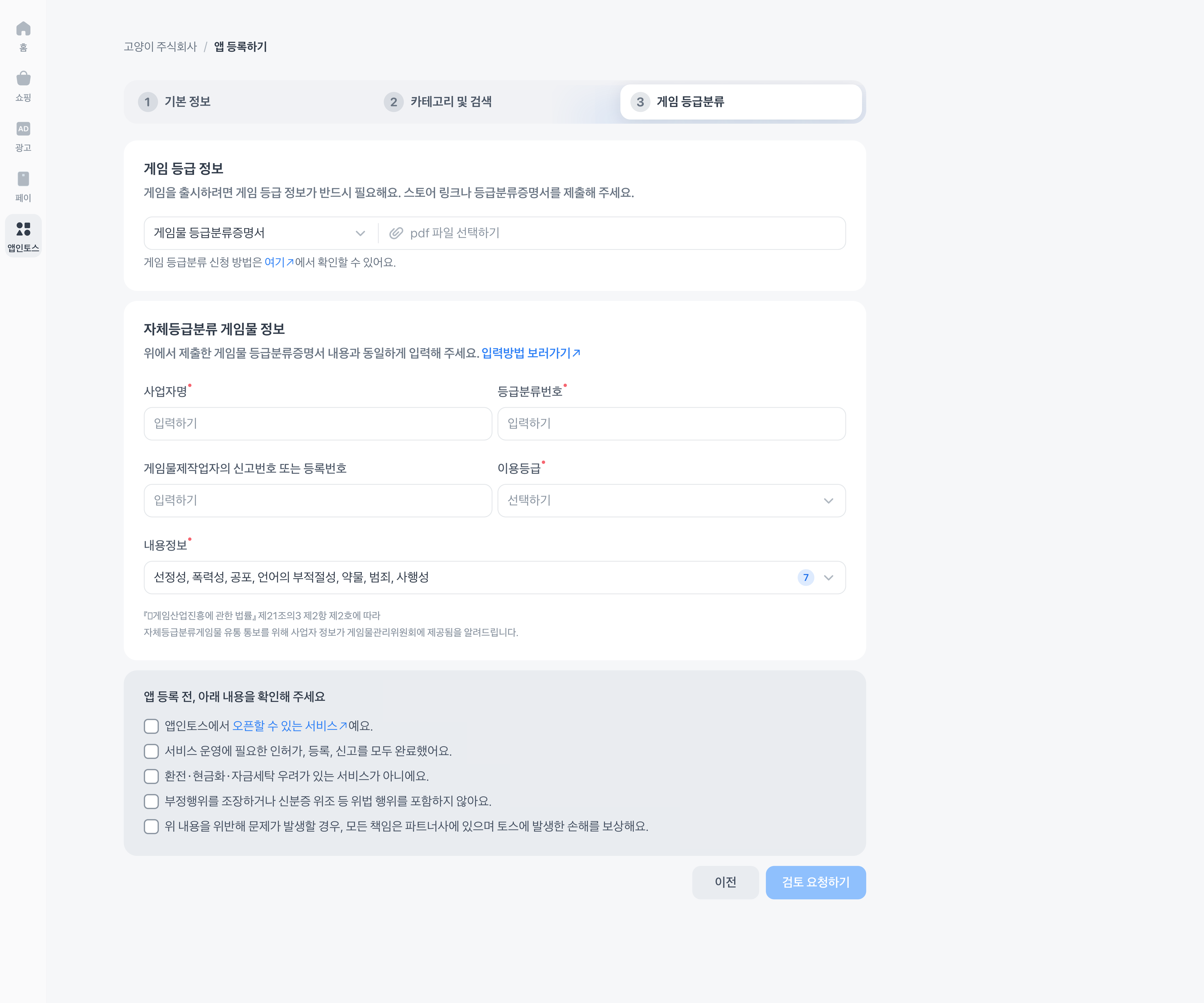 게임은 등급 심의 증빙 자료를 반드시 제출해야 해요.