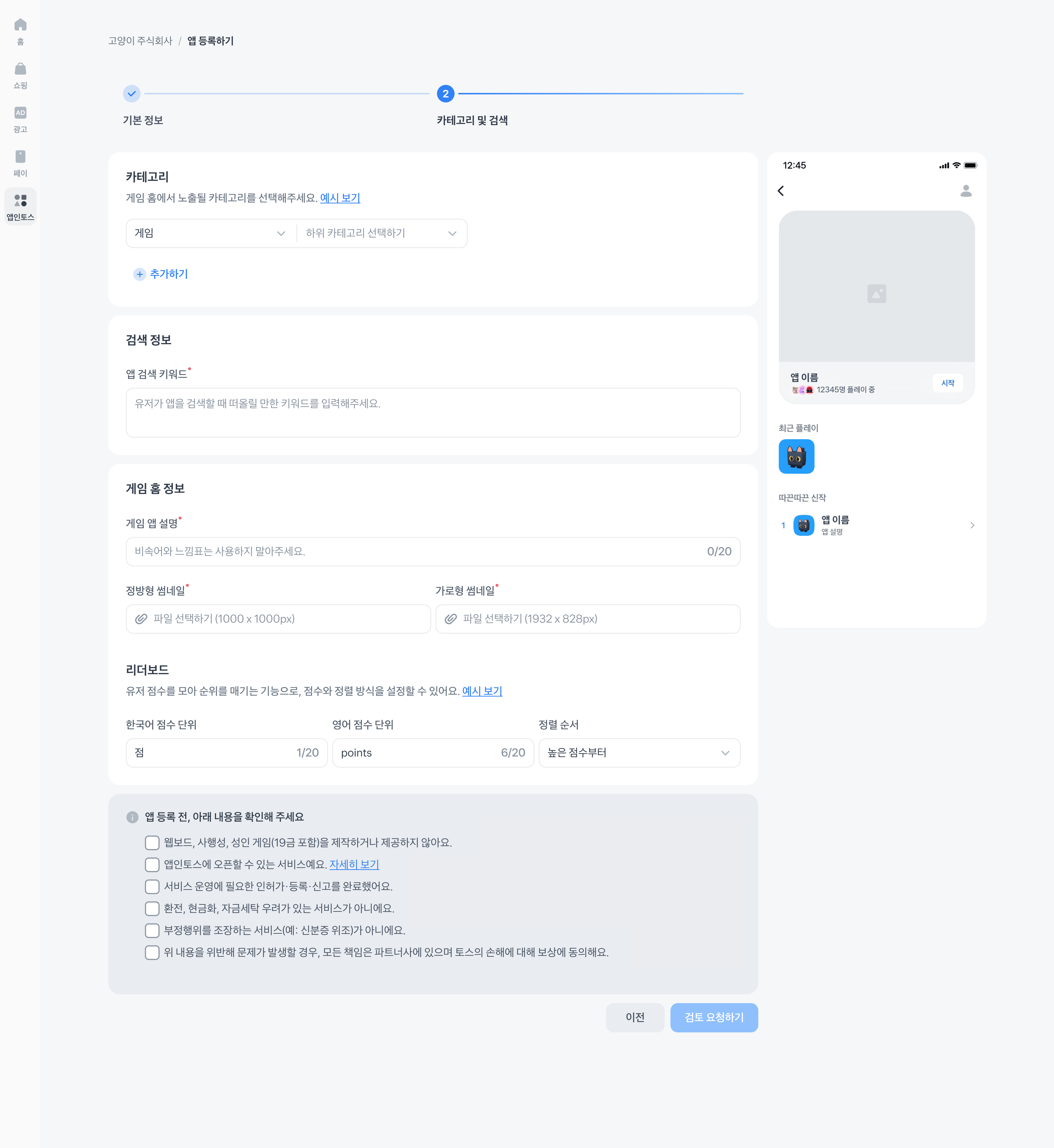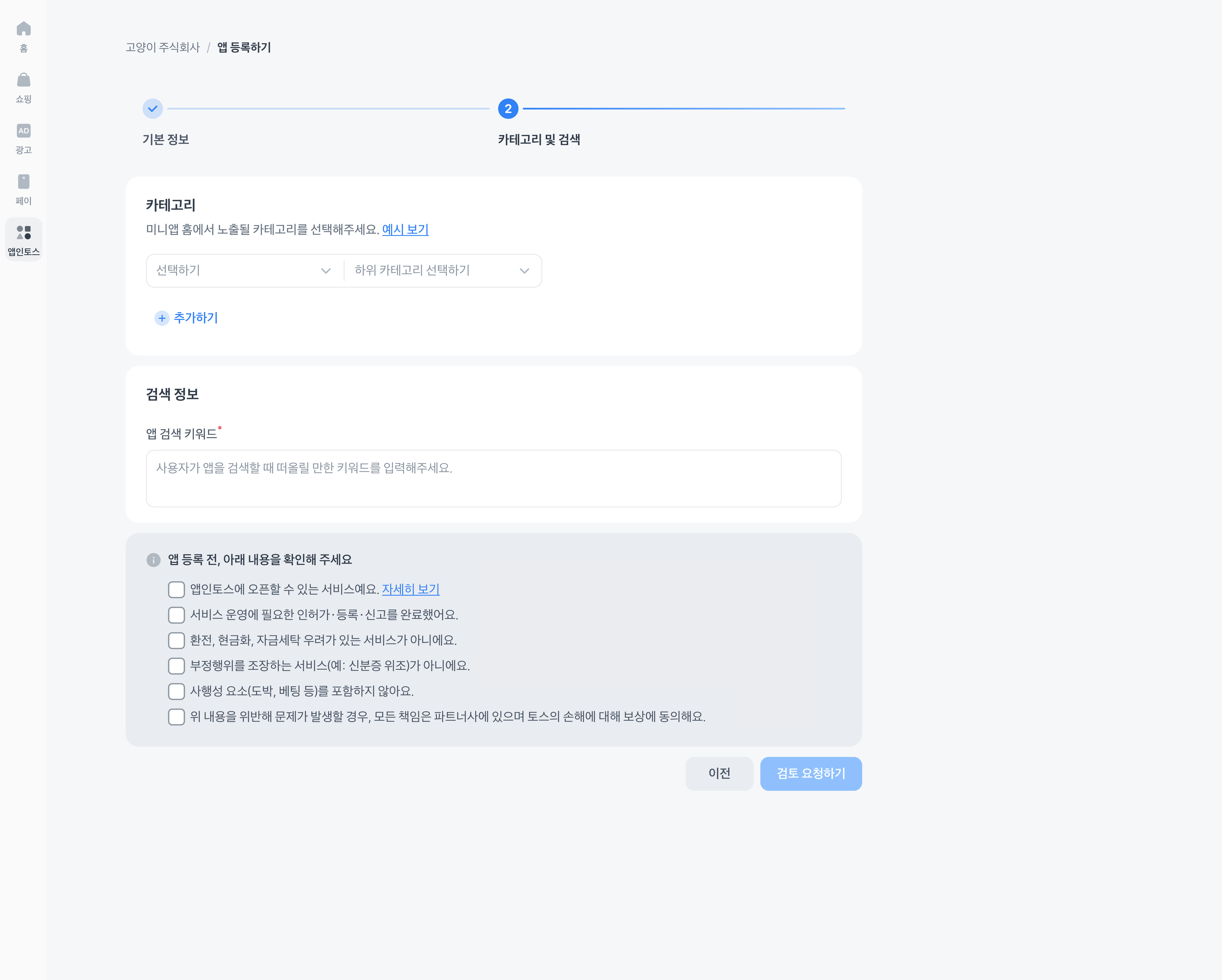 앱 등록 가이드라인에 알맞게 입력을 완료한 이후 ‘검토 요청’ 을 해주세요.