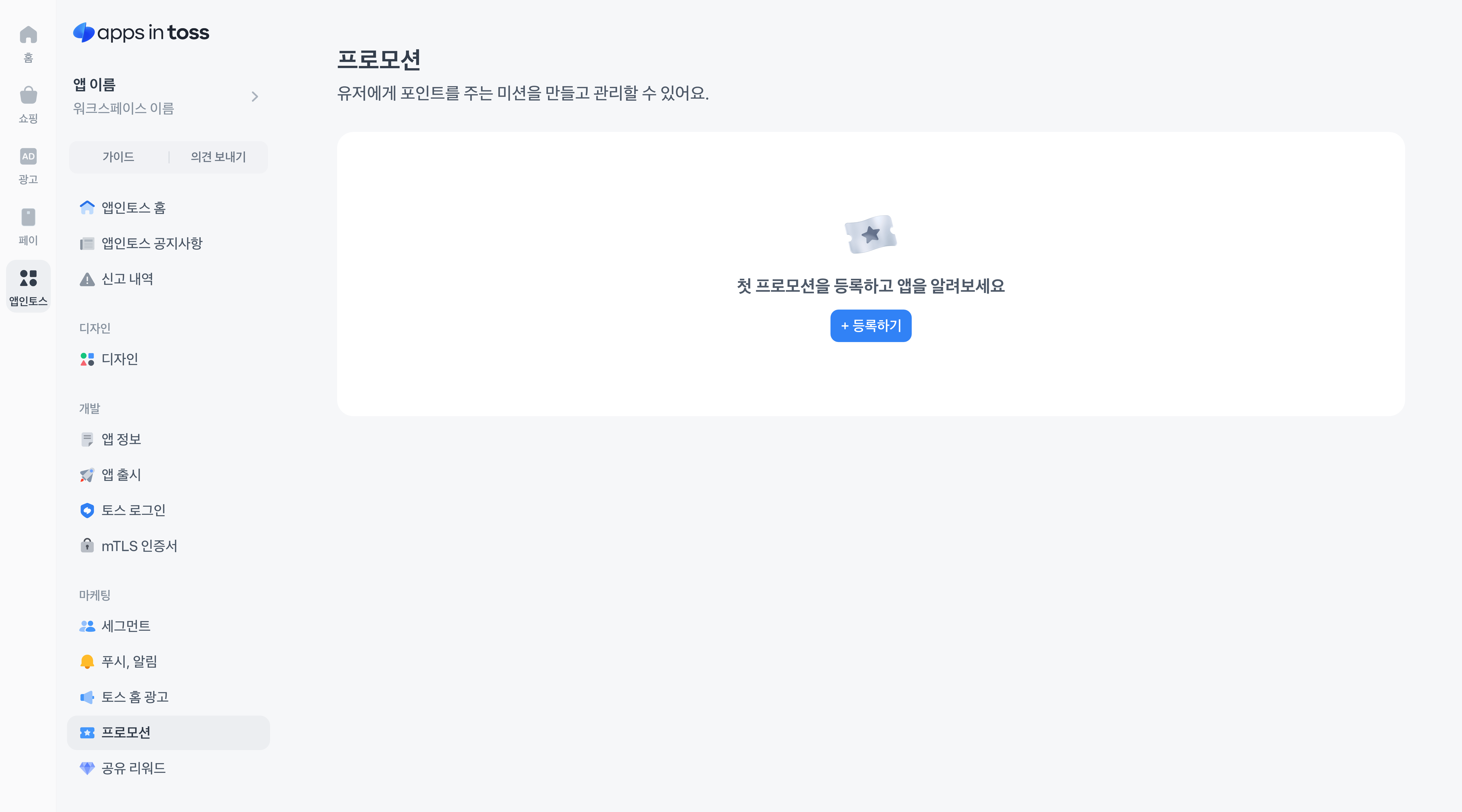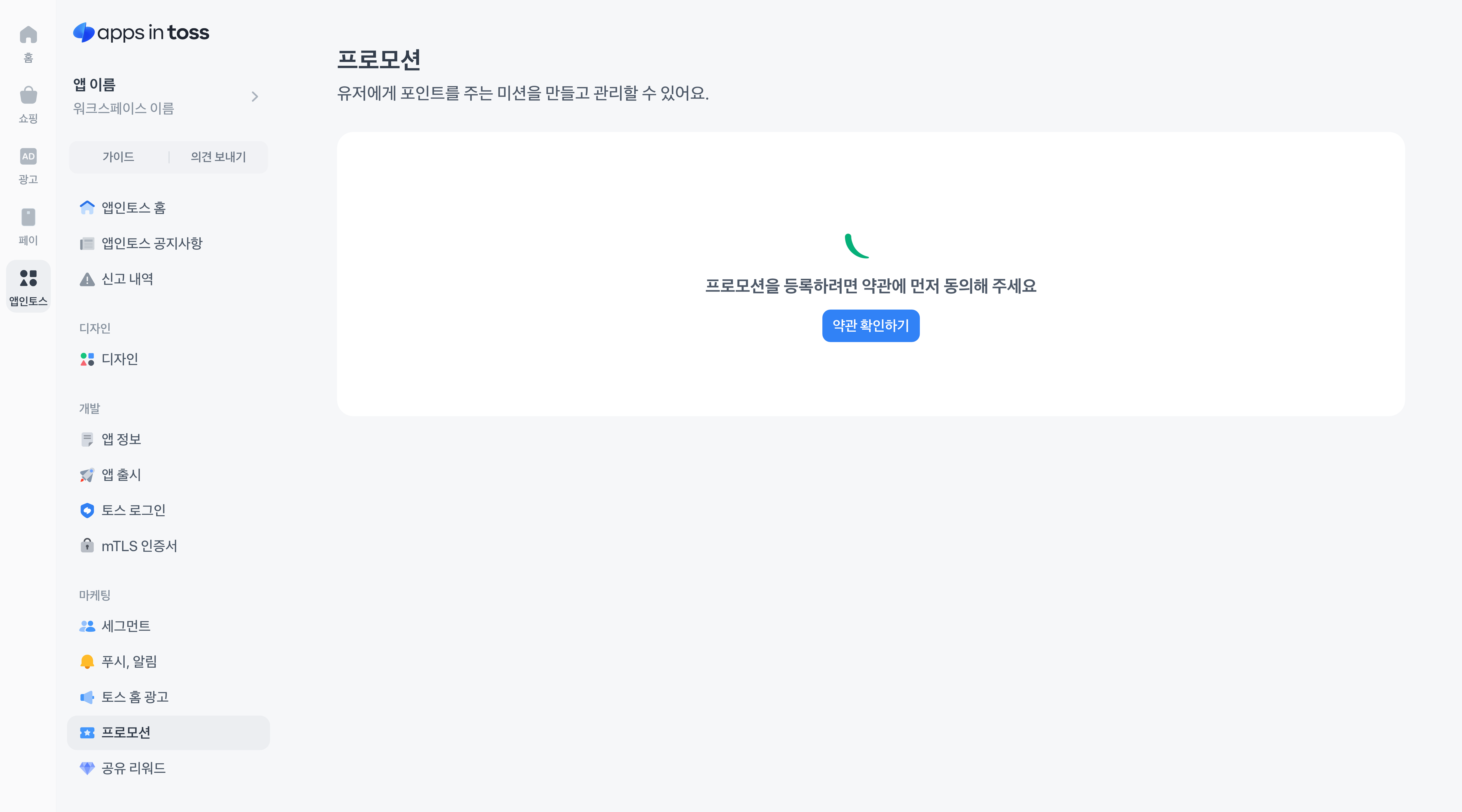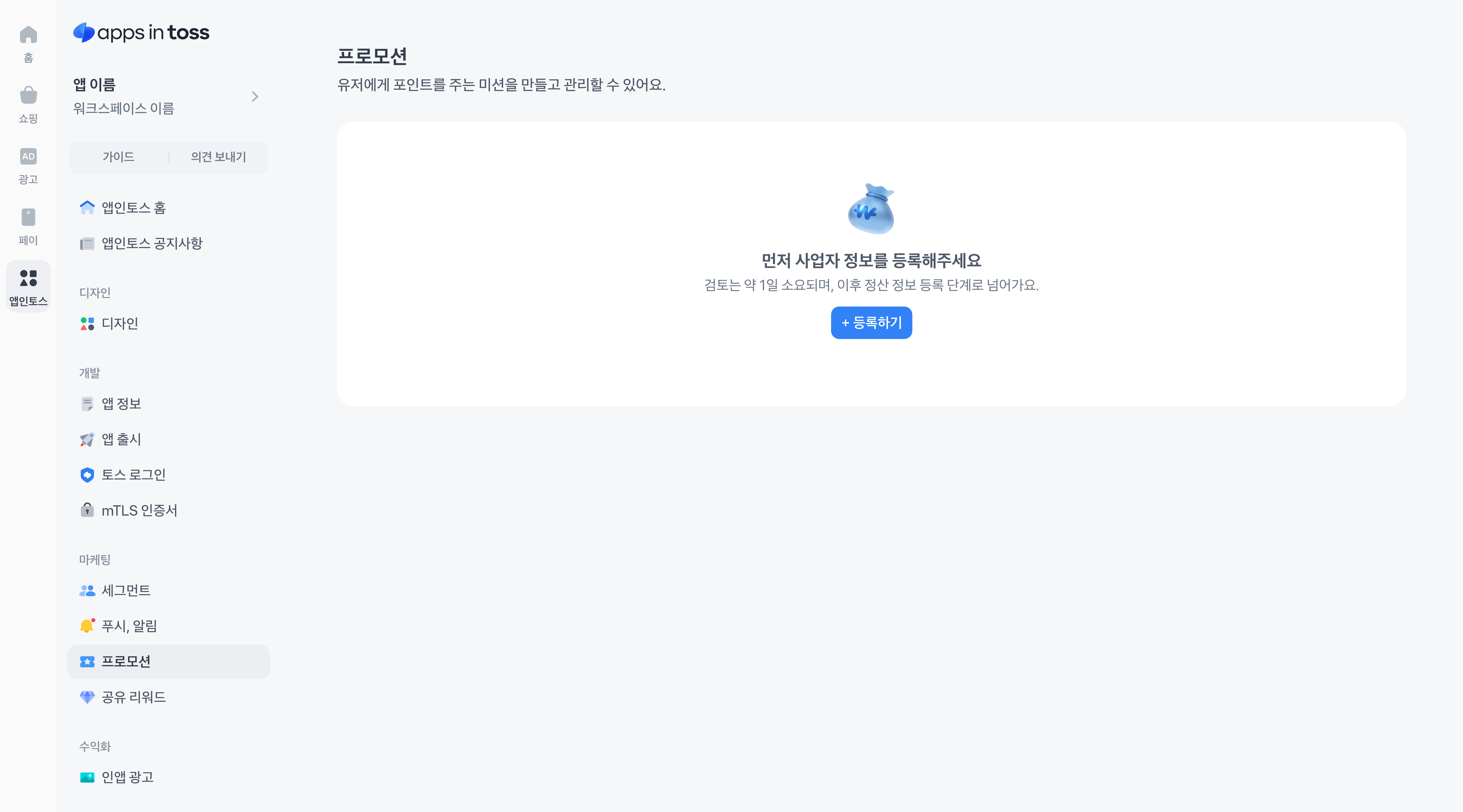 - 앱인토스 콘솔 접속 → 대표 관리자 계정 로그인 → 워크스페이스 선택 → 미니앱 선택 → 좌측 메뉴 중 ‘프로모션’ 선택