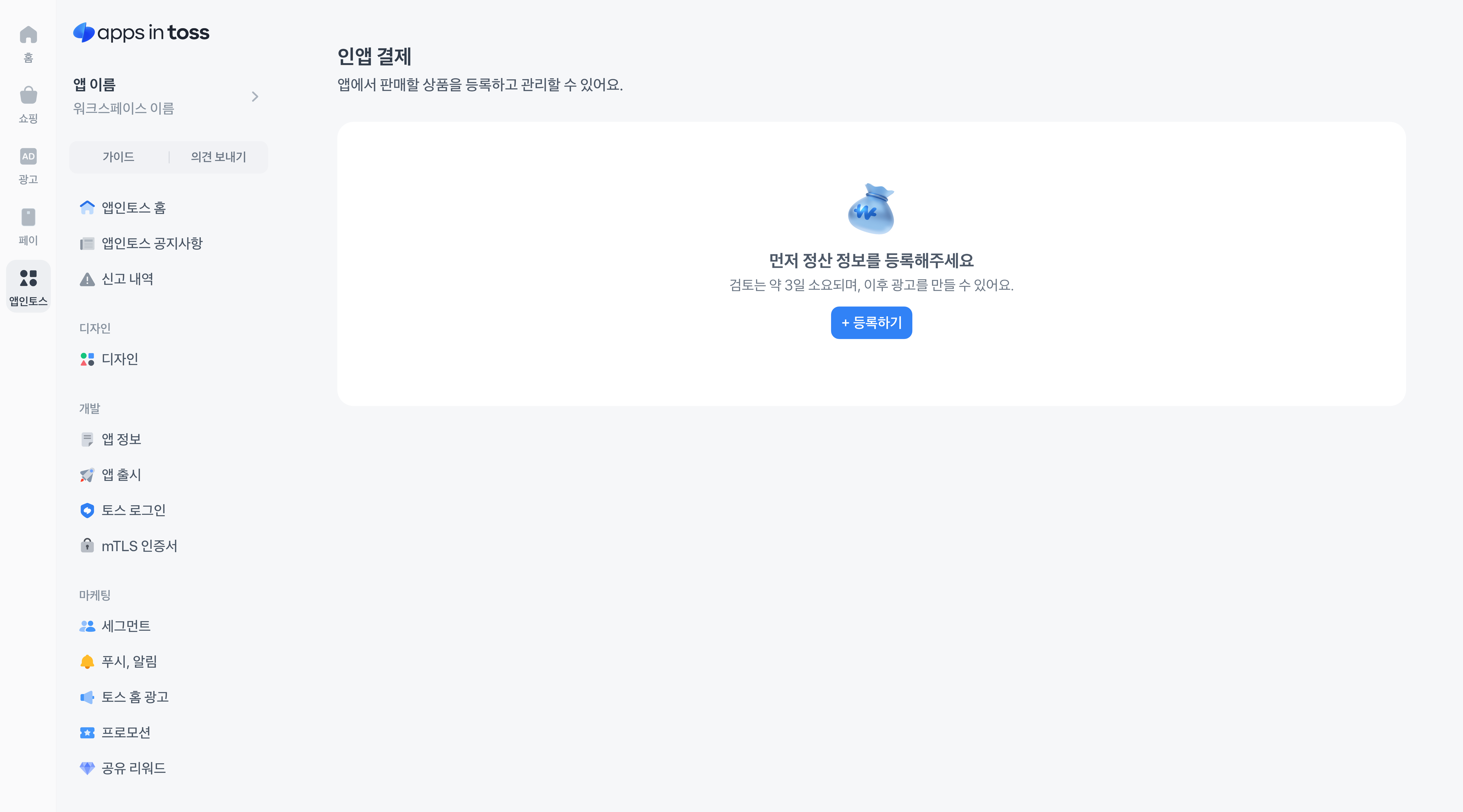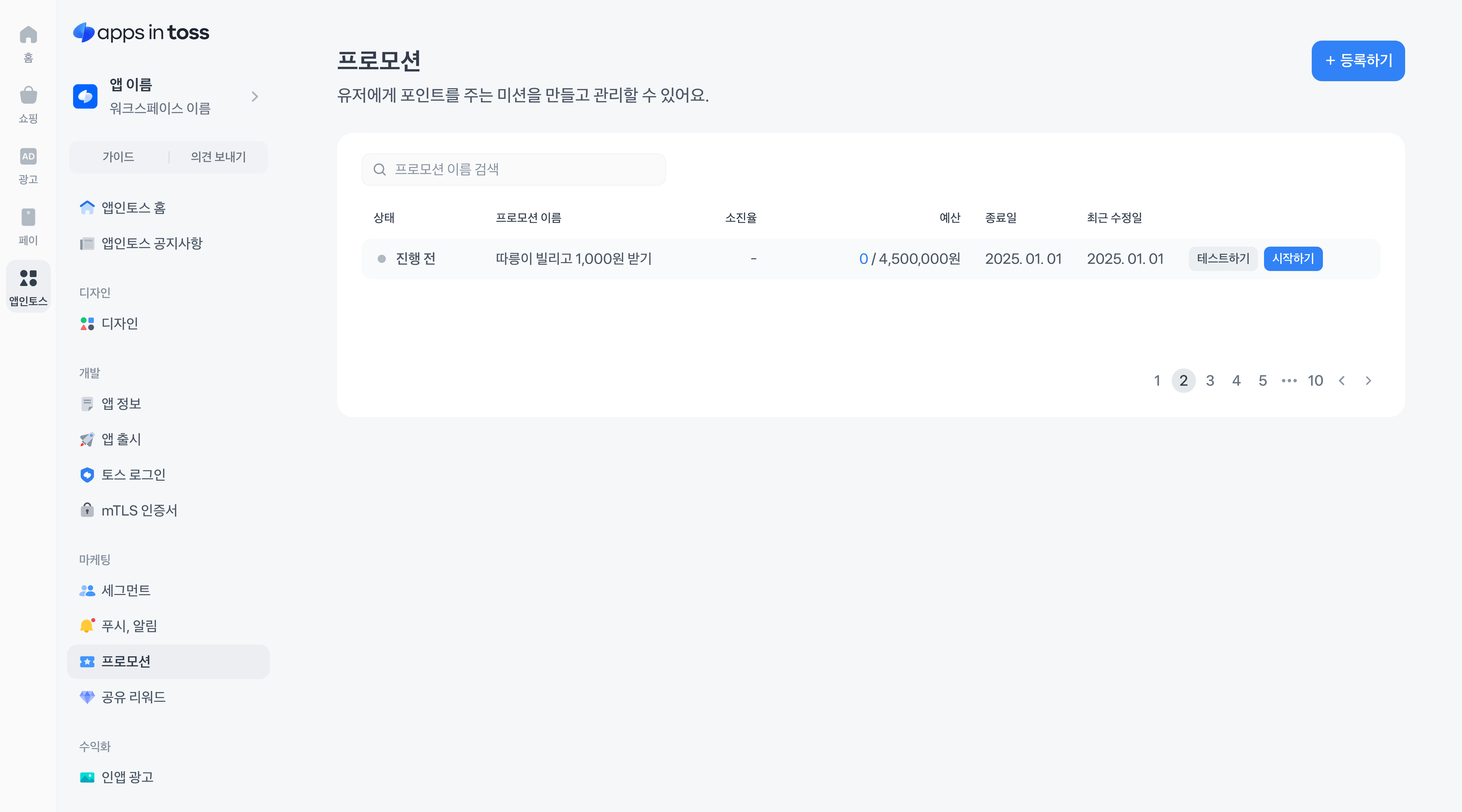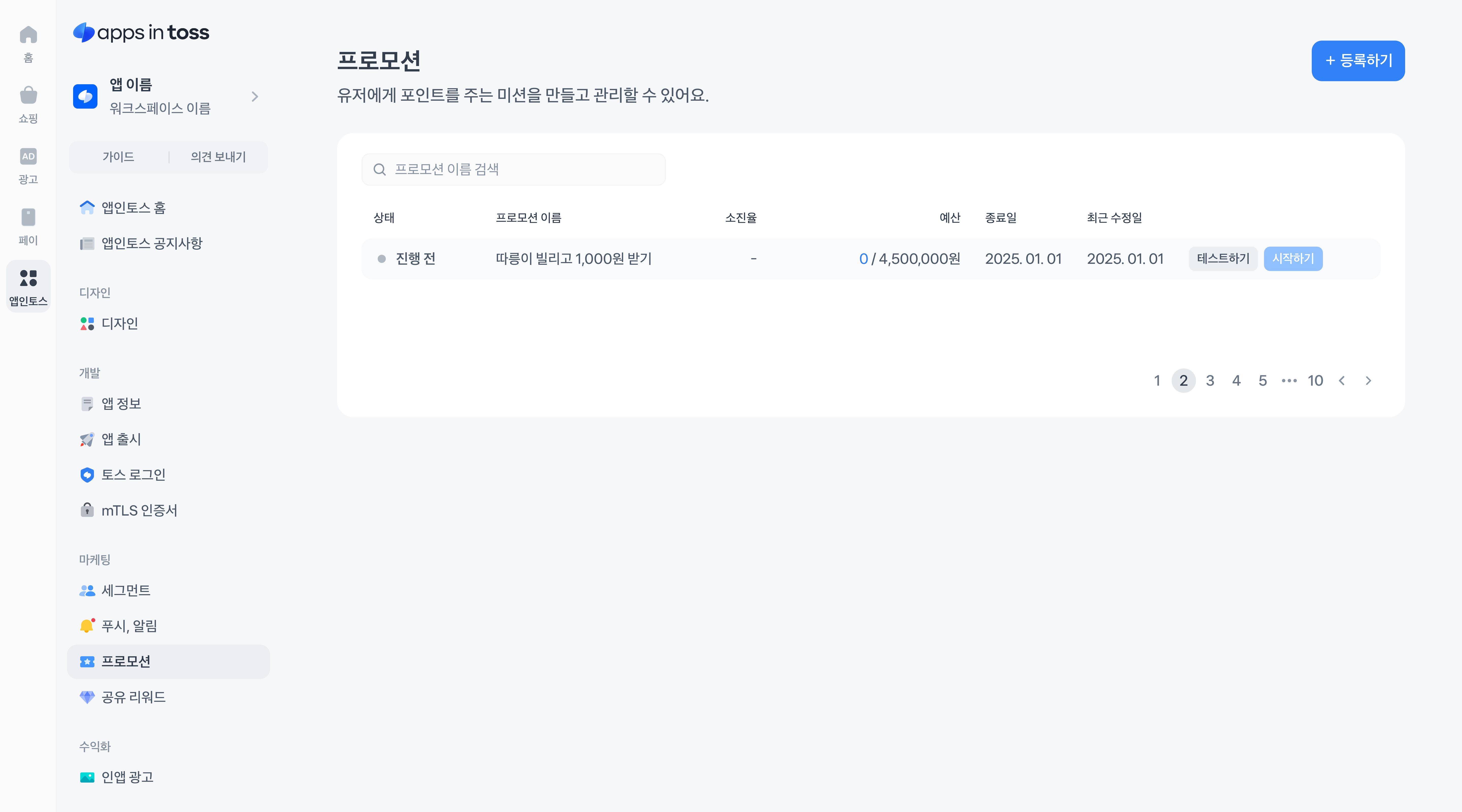- 앱인토스 콘솔 접속 → 대표 관리자 계정 로그인 → 워크스페이스 선택 → 미니앱 선택 → 좌측 메뉴 중 ‘프로모션’ 선택