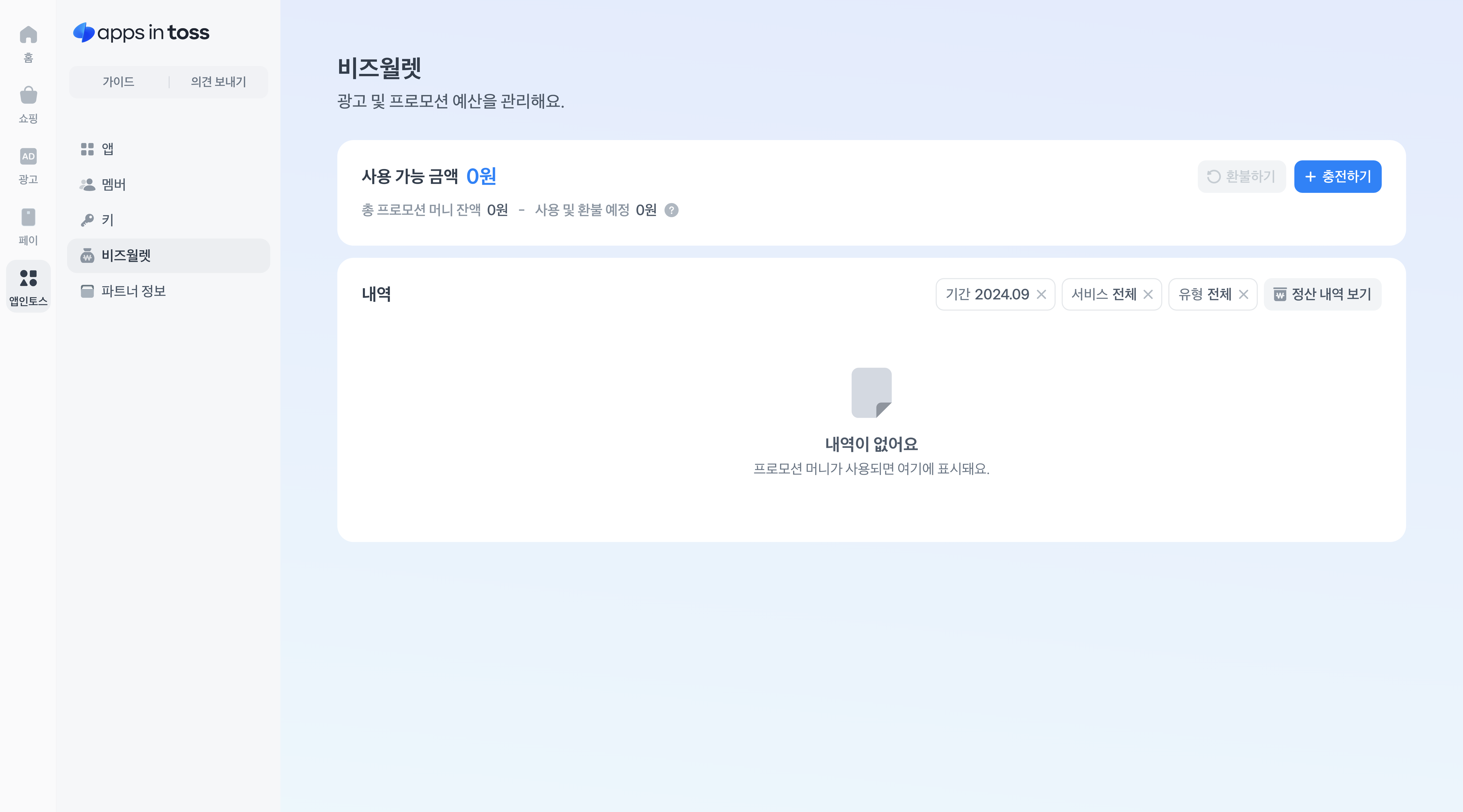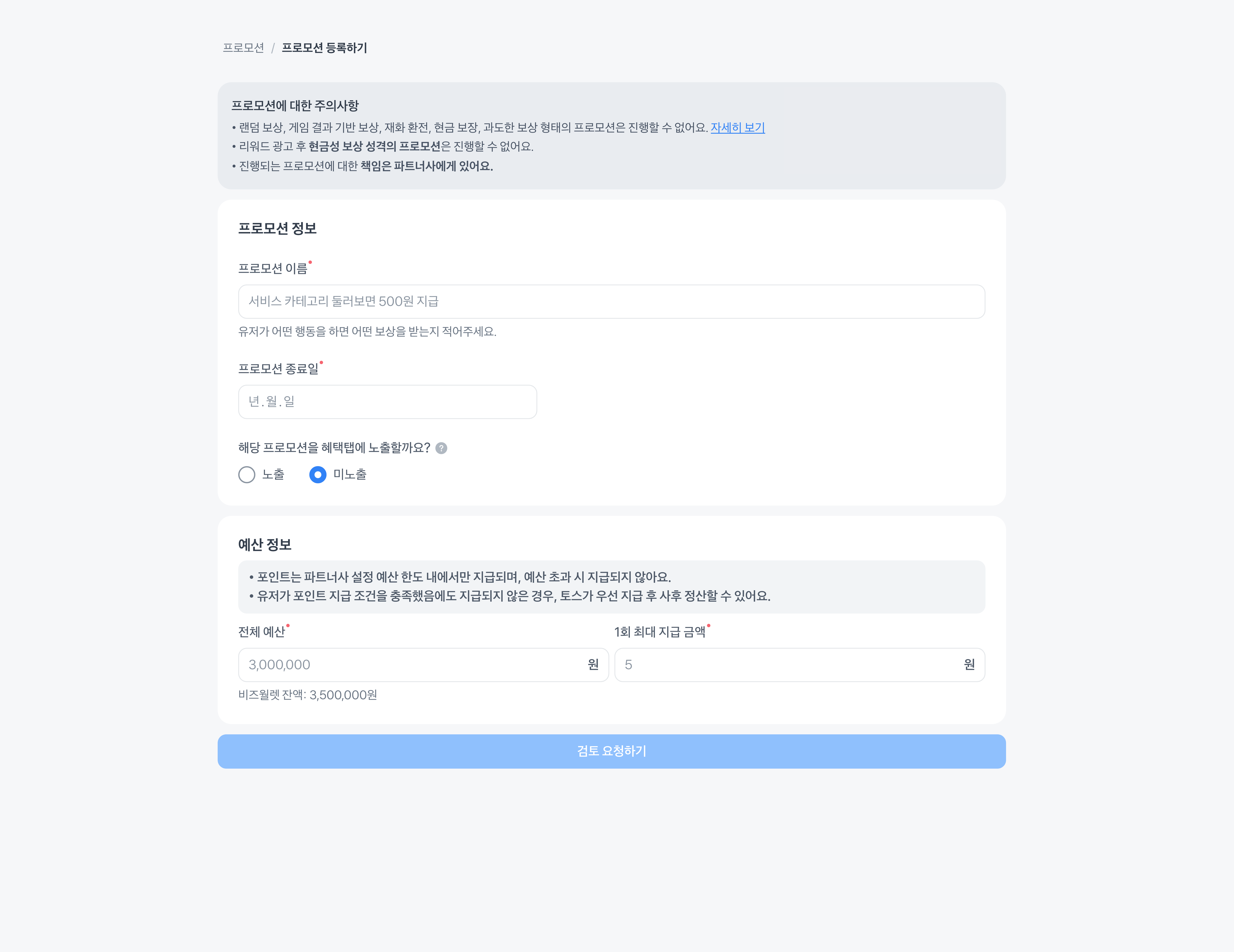 - 프로모션에서 사용할 예산의 비즈월렛 충전 필요