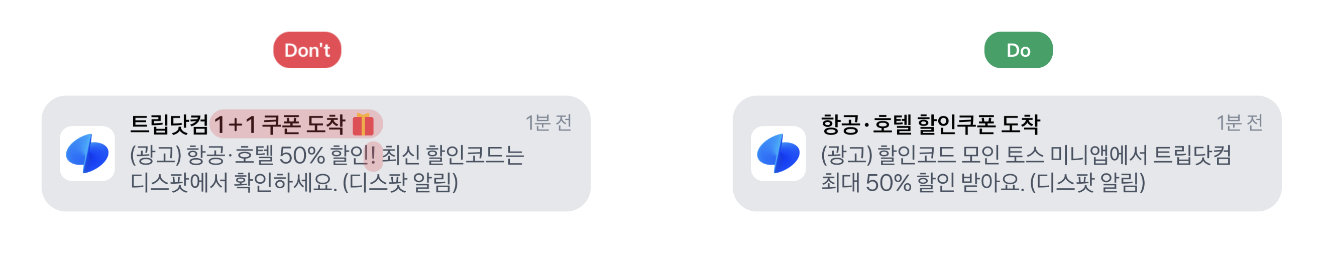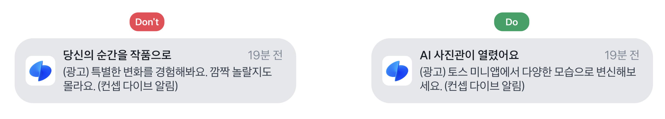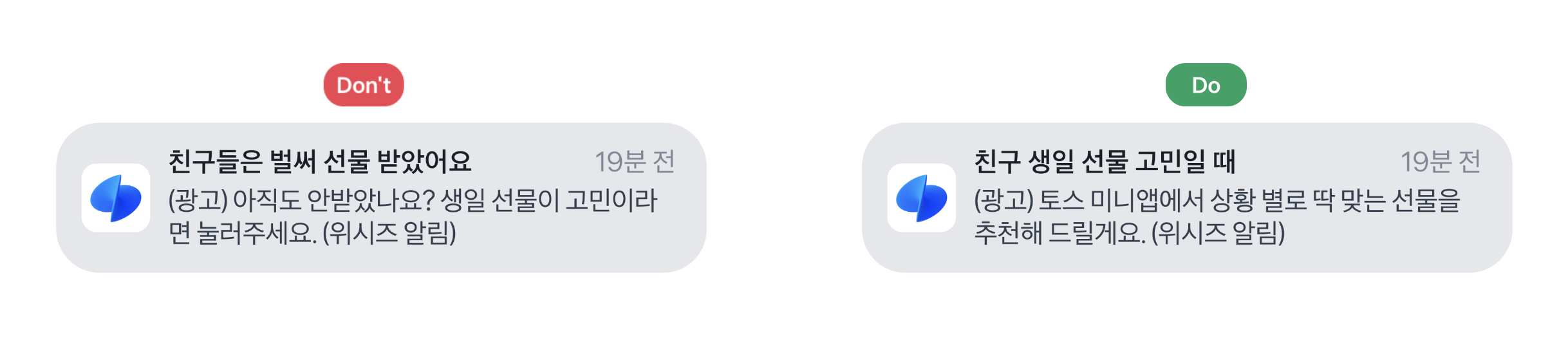 - 본문이 “(광고) 본문 ({미니앱 이름} 알림)”의 형태로 작성되어야 해요.