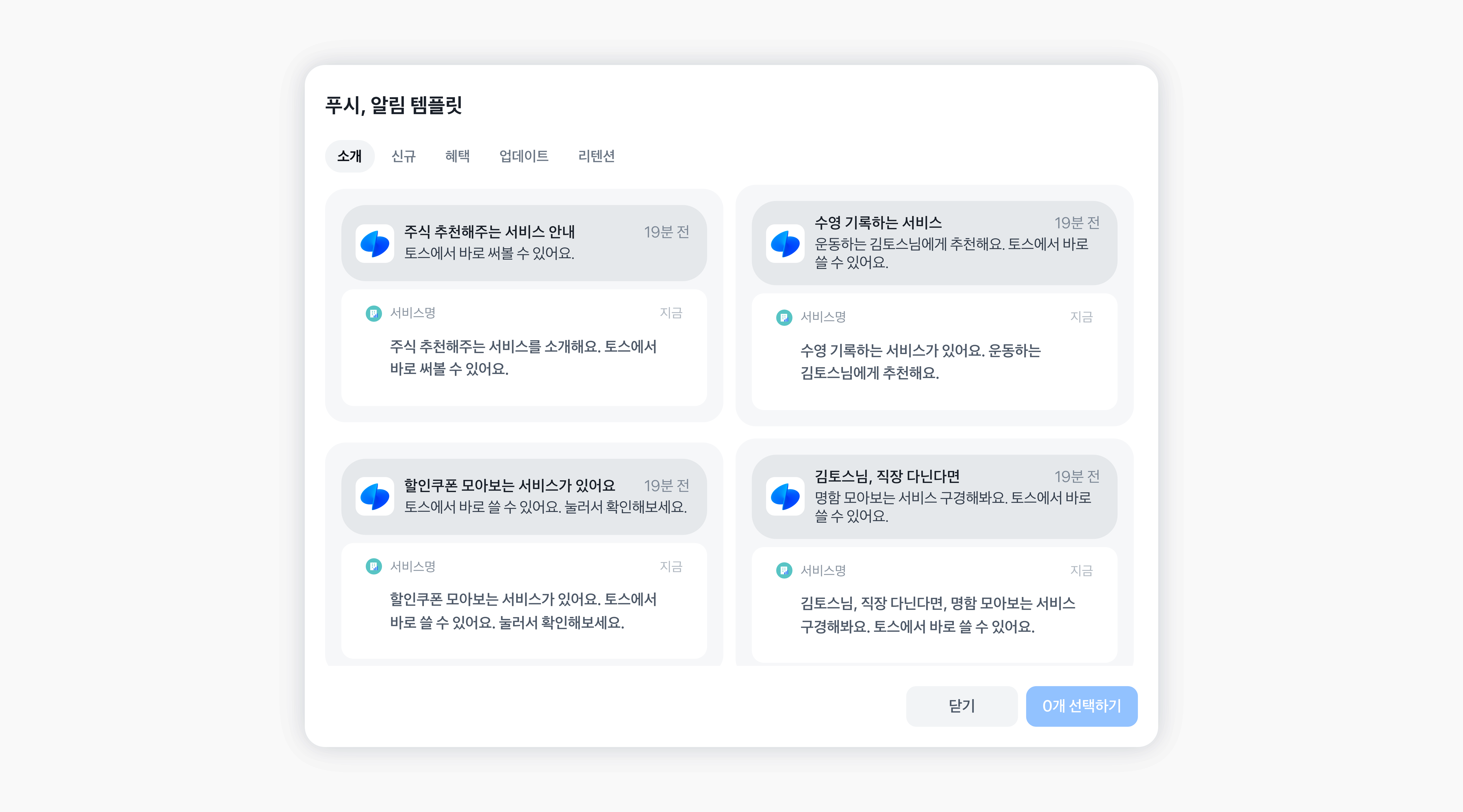 소개, 신규, 혜택, 업데이트, 리텐션 등 주제에 맞는 문구를 선택하고 수정할 수 있어요.