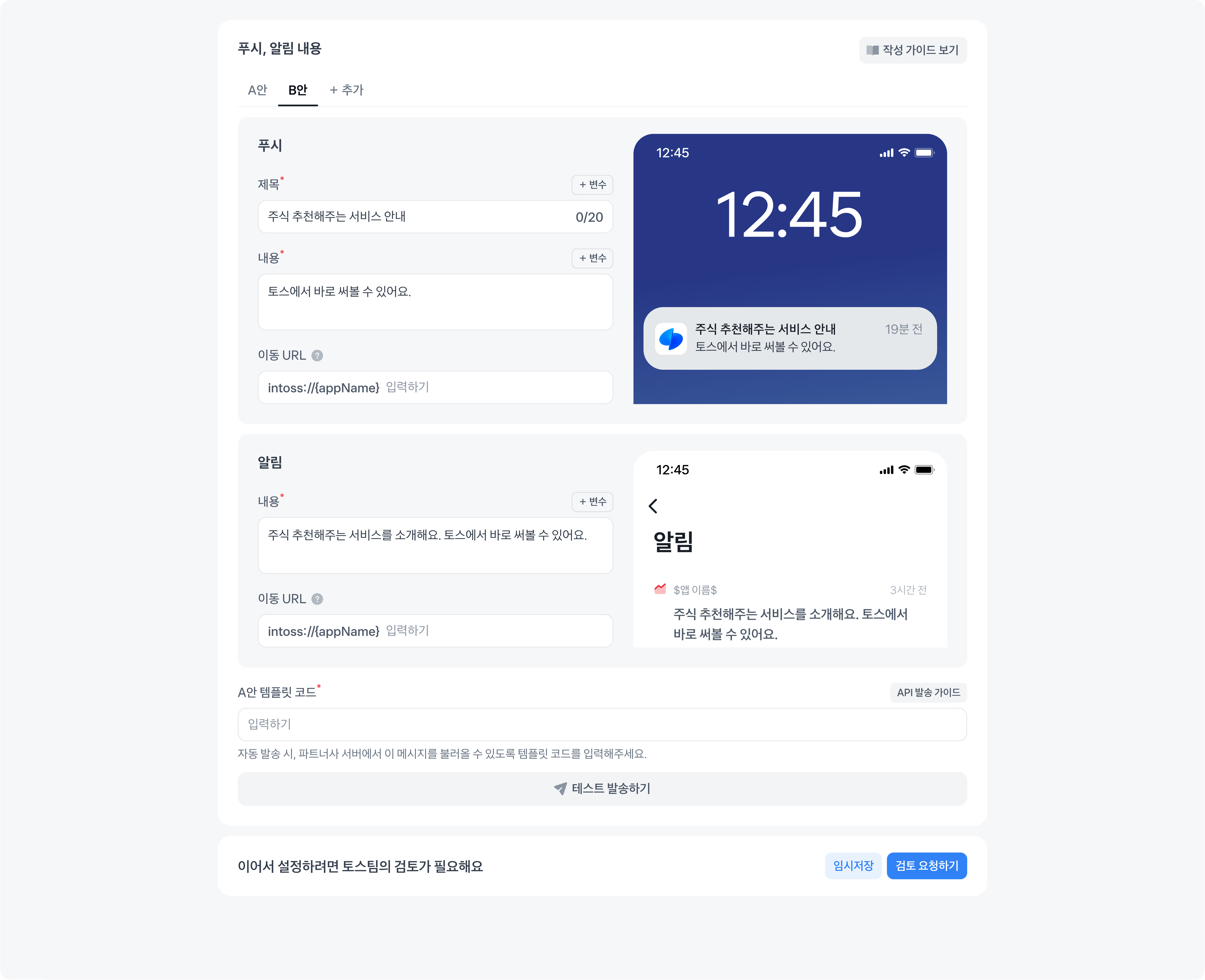 푸시, 알림 내용 작성 후 검토를 요청해 주세요.