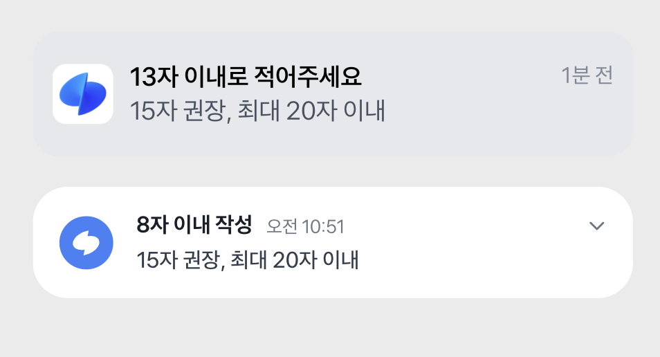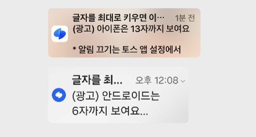 푸시 타이틀 최대 13자, 본문은 20자까지 써요