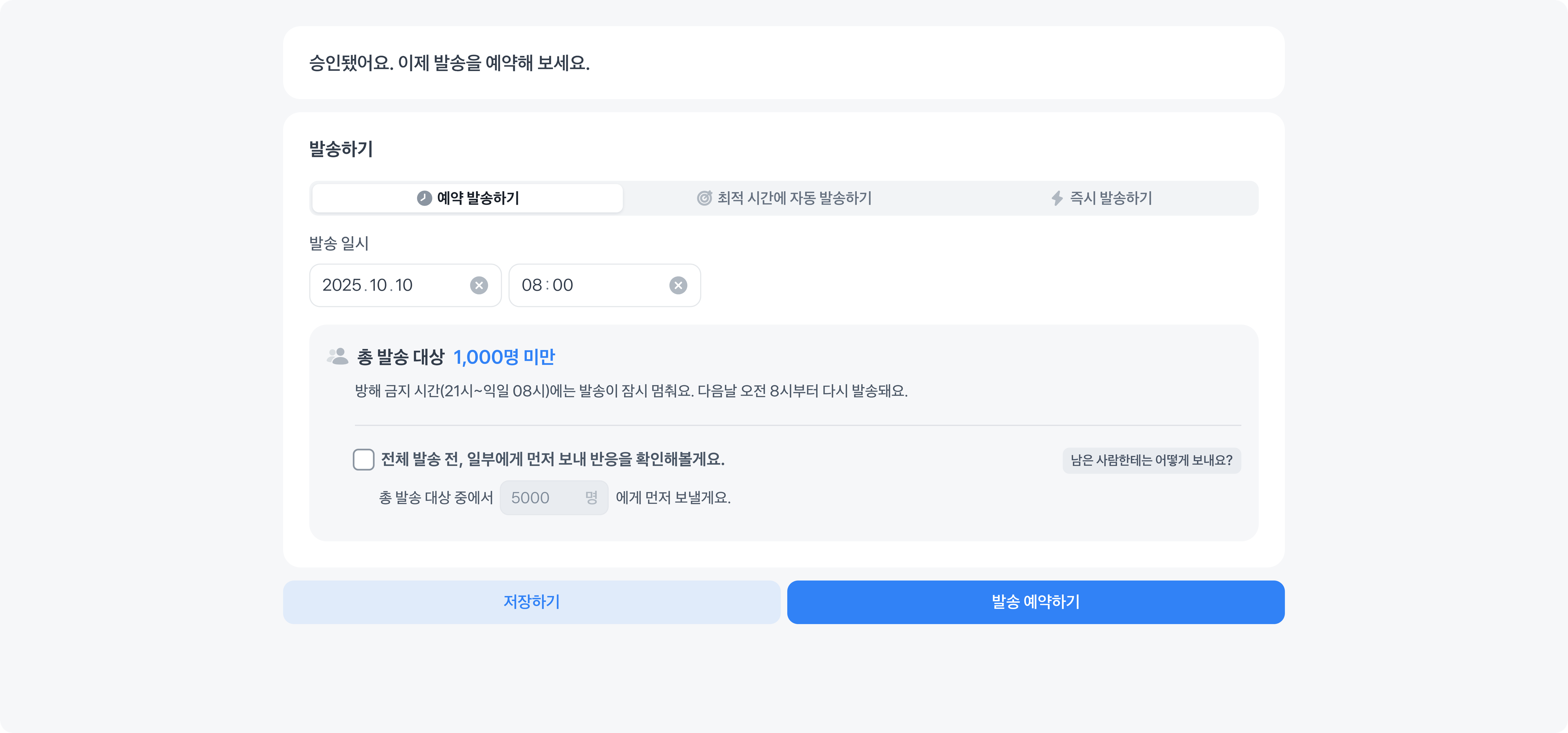 - 예약 발송하기: 원하는 일시에 발송할 수 있어요.