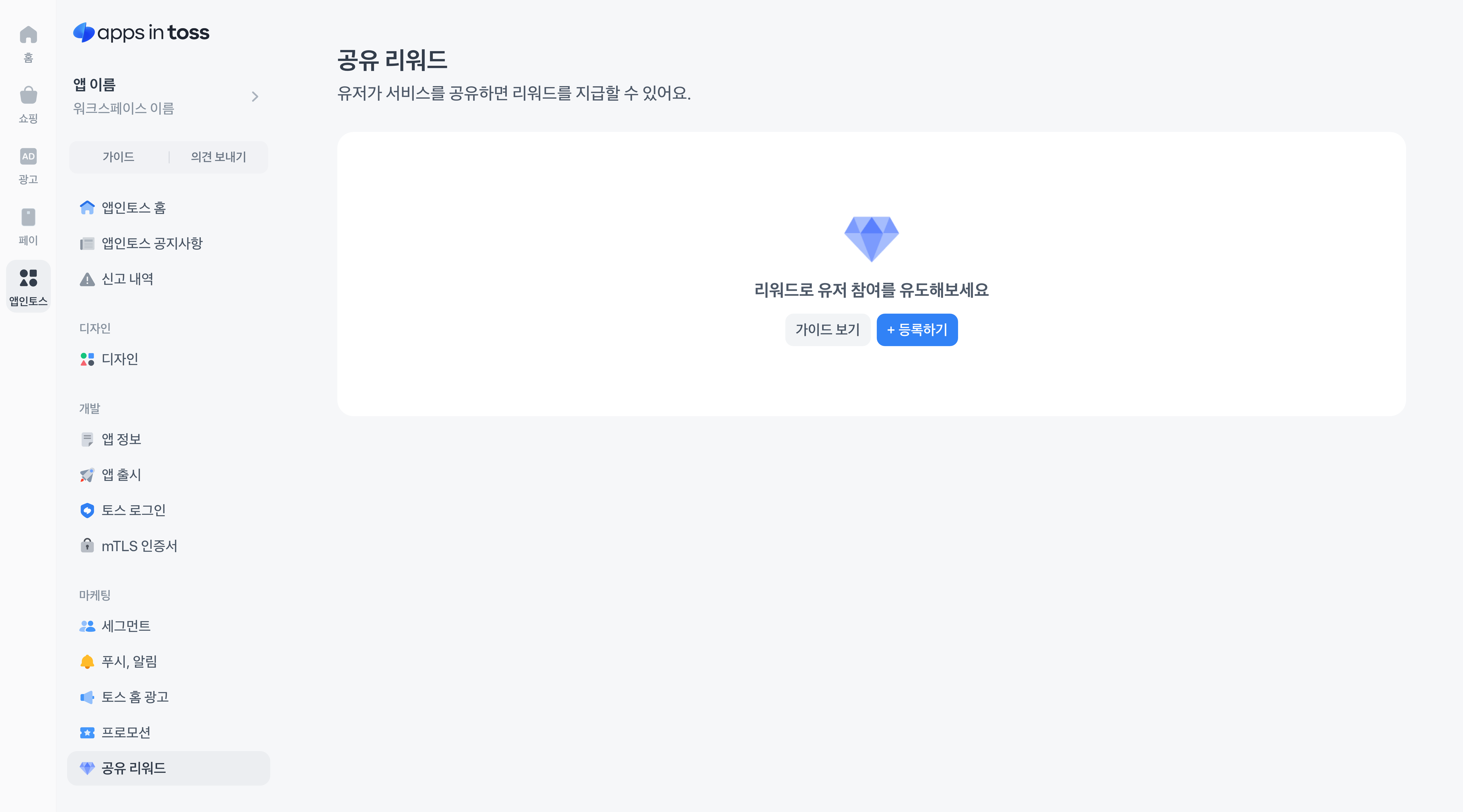 앱인토스 콘솔 좌측 메뉴에서 ‘공유 리워드’ 메뉴를 선택해 주세요.