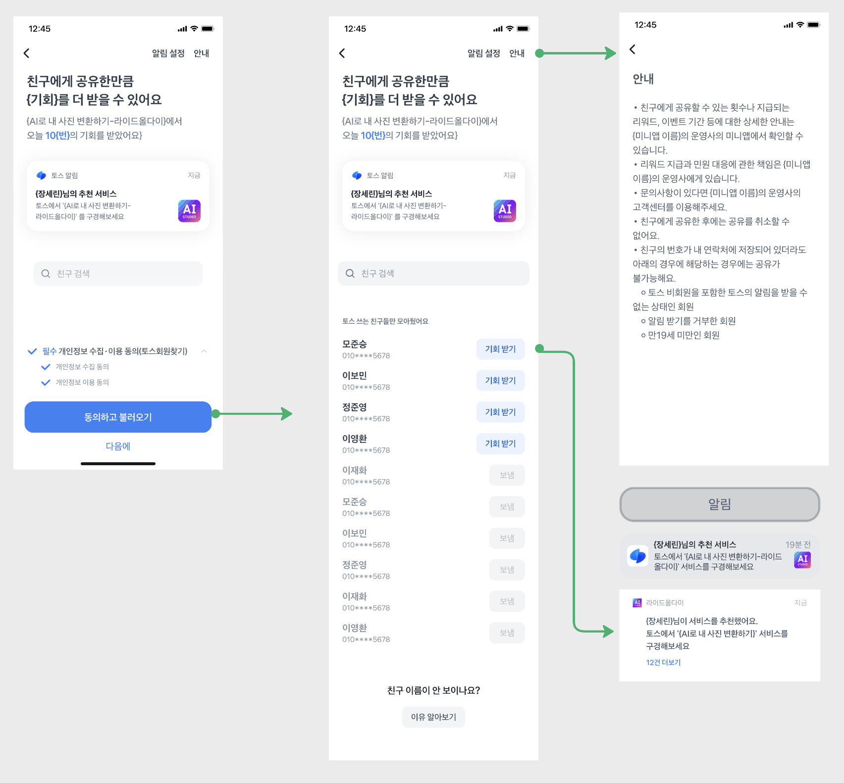 사용자가 친구 초대를 통해 리워드를 획득할 수 있어요. 콘솔에서 입력한 공유 리워드 화면을 노출하고, 사용자가 친구에게 공유하기를 완료하면 event를 전달드려요.contactsViral 페이지를 확인해주세요.