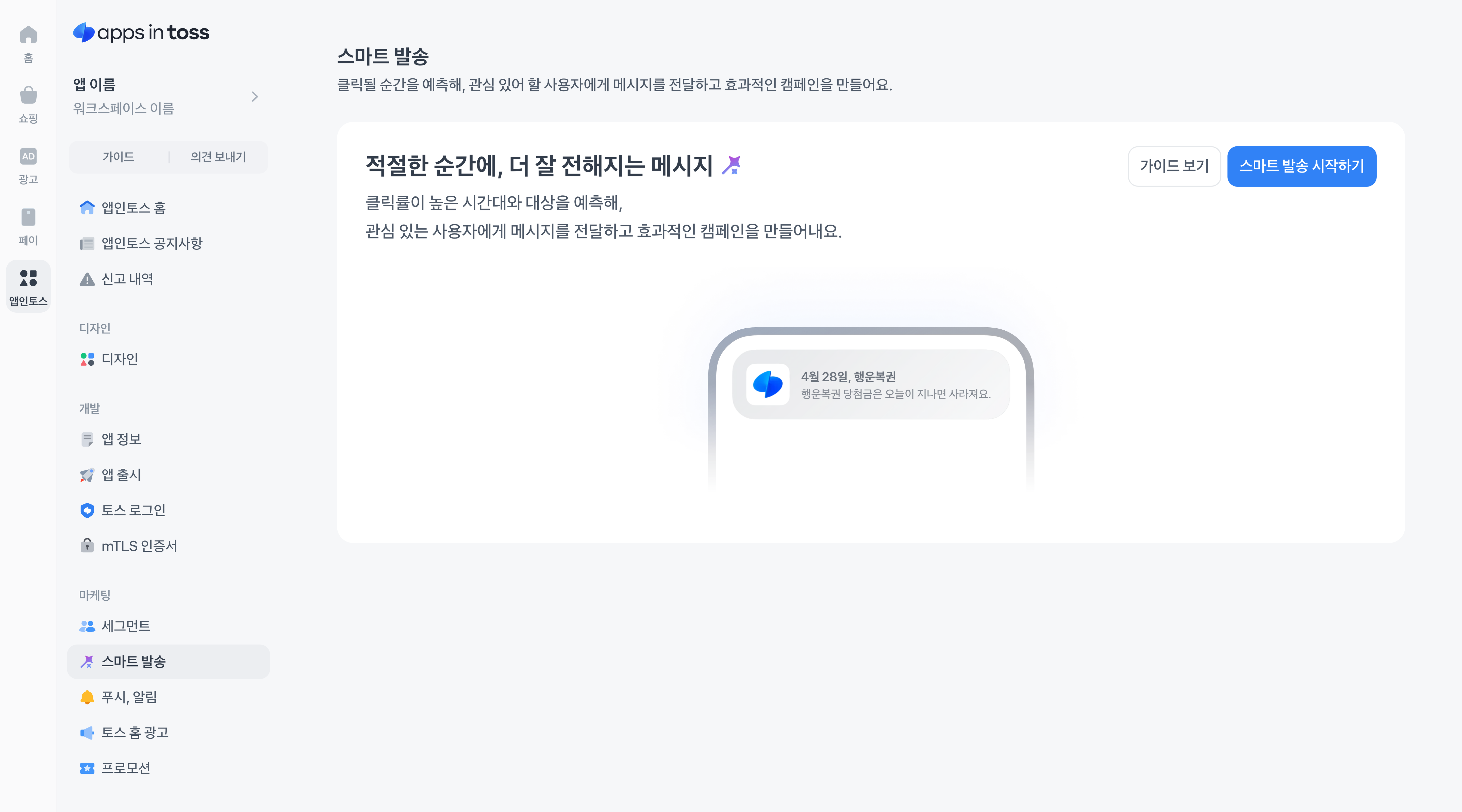 - 접속 방법: 앱인토스 콘솔 → 워크스페이스 선택 → 미니앱 선택 → 좌측 메뉴 ‘스마트 발송’ 선택