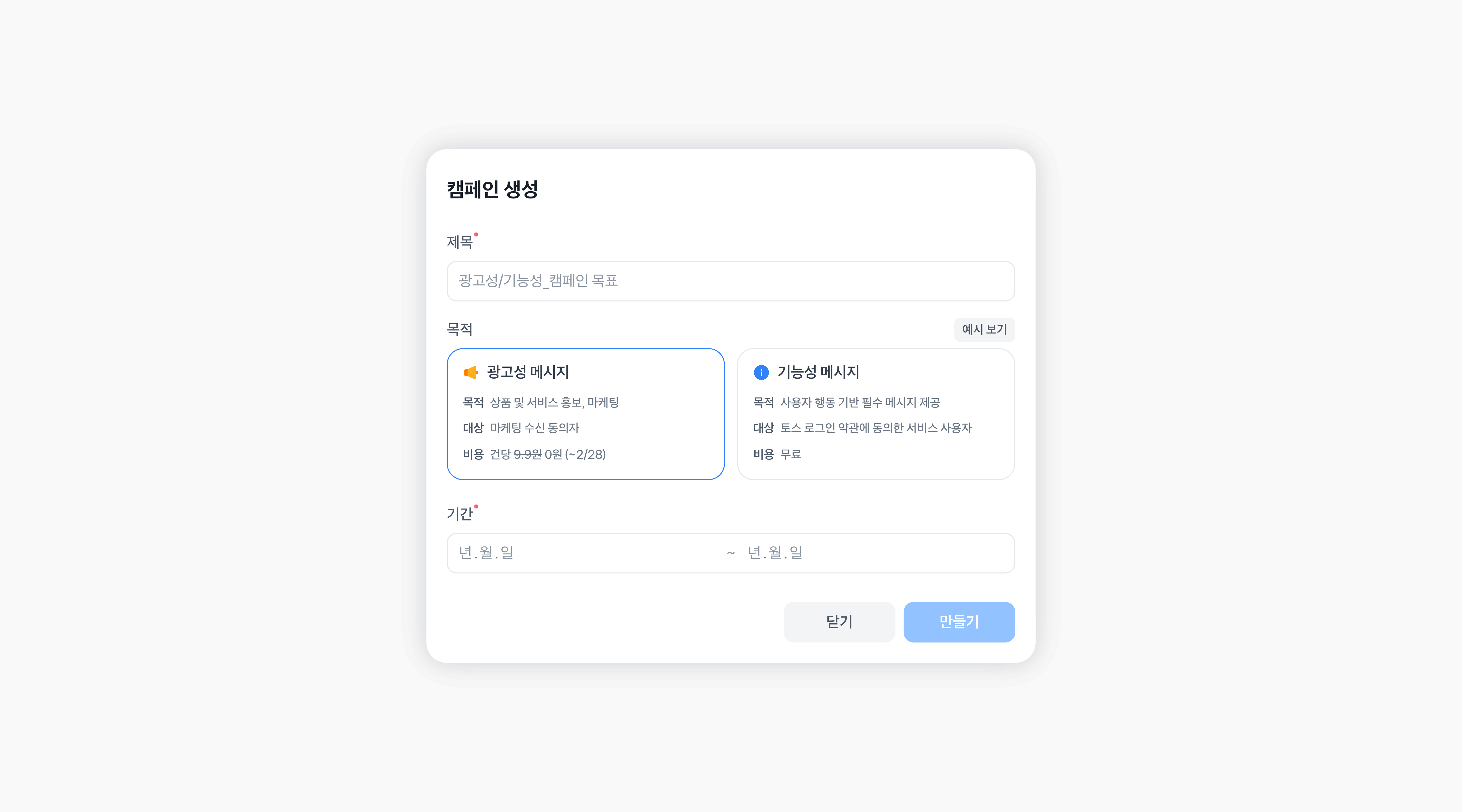 캠페인이 시작되는 시점과 종료되는 시점을 설정해요.메시지